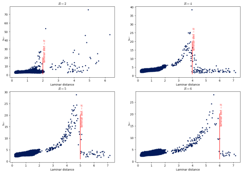 Figure B1Same as Fig. 11 but for the Lorenz 96 system with n=4 and F=11.87 (106 points in the trajectory). The vertical red lines mark the value of the laminar distance which is equal to the radius R, and the horizontal line marks the values 2 for .