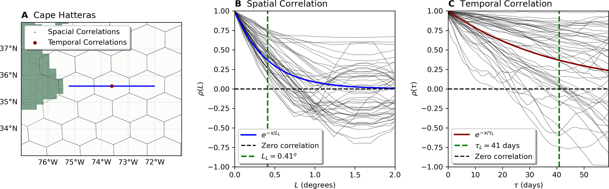 Figure 2(A) Map of Cape Hatteras showing the points used to compute the spatial correlations (blue) and the location used to compute the temporal correlations (red). The hexagons mark the limits of the hexagonal grid used in subsequent analyses, and the green area represents the North American coast. (B) Spatial correlations function around the release location, and each black line shows the correlation function for an ensemble member. The blue line shows the exponential fit computed over the 50 correlation functions. The green line shows the decorrelation length scale . (C) Temporal correlations with velocities sampled daily for 60 d from 2 January 2010. The black lines show the correlation functions of single ensemble members, and the red line shows the exponential fit with a decorrelation timescale of 41 d.