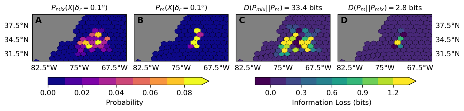 Figure 3Comparison of probability distributions and their relative entropy. (A) Mixture distribution ) at 15 d after release, representing the full probabilistic model. (B) Single-member distribution ) at 15 d after release, representing the reduced-order approximate model. (C) Information loss map showing the contribution of each grid cell to the total relative entropy when approximating the mixture distribution with the single-member distribution. (D) Information loss map showing the contribution of each grid cell to the total relative entropy when approximating the single-member distribution with the mixture distribution. Gray hexagons represent land. Color scales show probability values (A, B) and information loss in bits (C, D). The zero-bit value falls within the second color bin from the left in the information loss color scale.