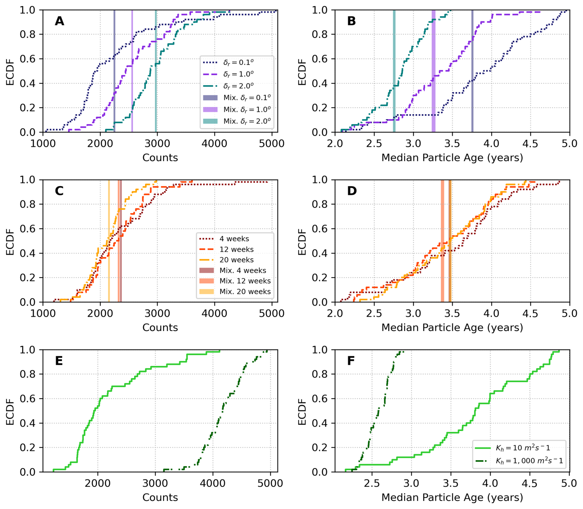 Figure 4C shows the ECDFs for temporally varying releases. The distributions for the single-member simulations with 4, 12, and 20-week releases are similar but show more variance than the mixture distributions represented by the shaded lines. Mixture distributions for 4- and 12-week releases have comparable average particle counts, while 20-week releases show slightly lower averages. For single-member simulations, the probability of having fewer particles than the mixture distribution average (δr=0.1°) is 0.56 (with 0.44 probability of overestimation) for 4-week releases, 0.50 (with 0.50 probability of overestimation) for 12-week releases, and 0.66 (with 0.34 probability of overestimation) for 20-week release periods.