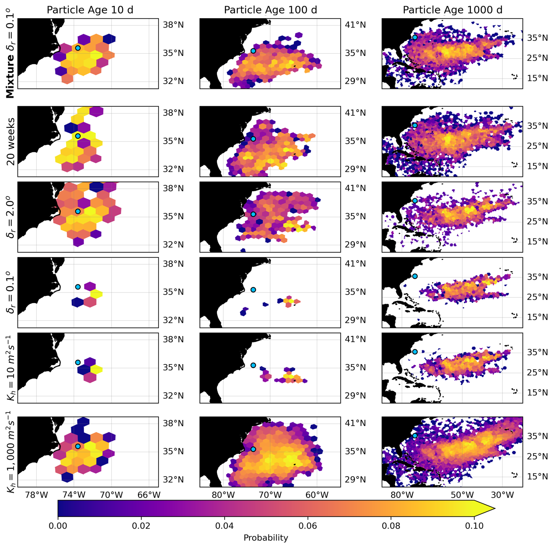 Figure 5Probability distributions of particle locations at different ages (10, 100, and 1000 d; columns) across varying release strategies (rows). The top row shows the probability of the mixture δr=0.1° distribution (mixture subset 43 of the bootstrapping). The second, third, fourth, and fifth rows show the single-member distributions (member 22), with 20-week, δr=2.0°, δr=0.1°, and with diffusion Kh=10 m2 s−1 and Kh=1000 m2 s−1. The blue circles mark the particle's release location, omitted for plots of particle age of 10 d. Bins with probability zero were removed to facilitate visualizing the area of dispersal of the particles.