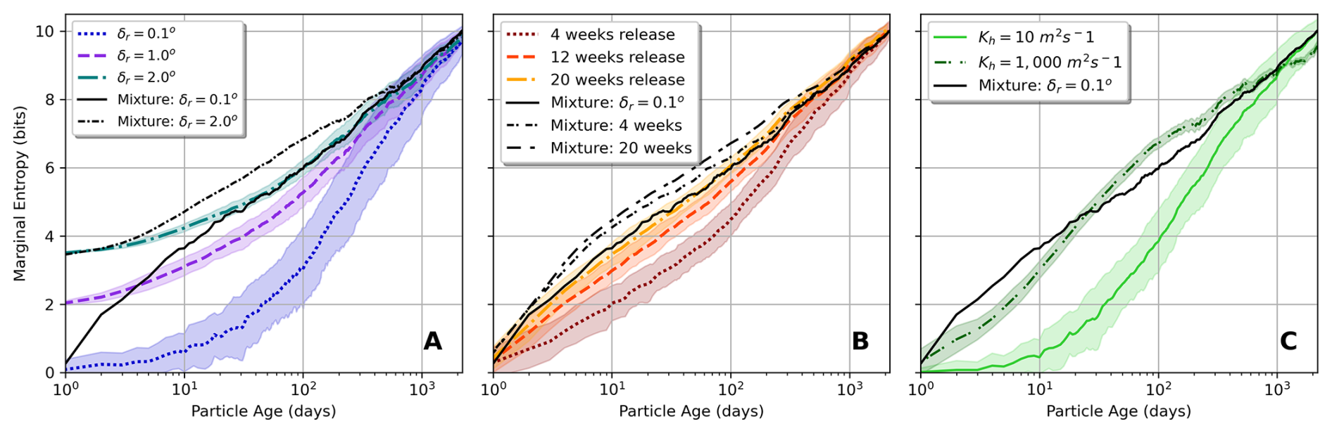 Figure 6Average marginal entropy as a function of particle age of single-member distributions (colored lines) and mixture distributions (black lines). The average marginal entropy for the single-member simulations with diffusion Kh is shown as black triangle curve. The shaded areas represent the standard deviation. The particle age is on a logarithmic scale. (A) Comparison of the single-member and mixture distributions with spatially varying release. (B) Comparison of the single-member and mixture distributions with temporally varying release. (C) Comparison of the single-member distributions with diffusion. In all panels, we added the entropy curve of the mixture δr=0.1° as a reference.