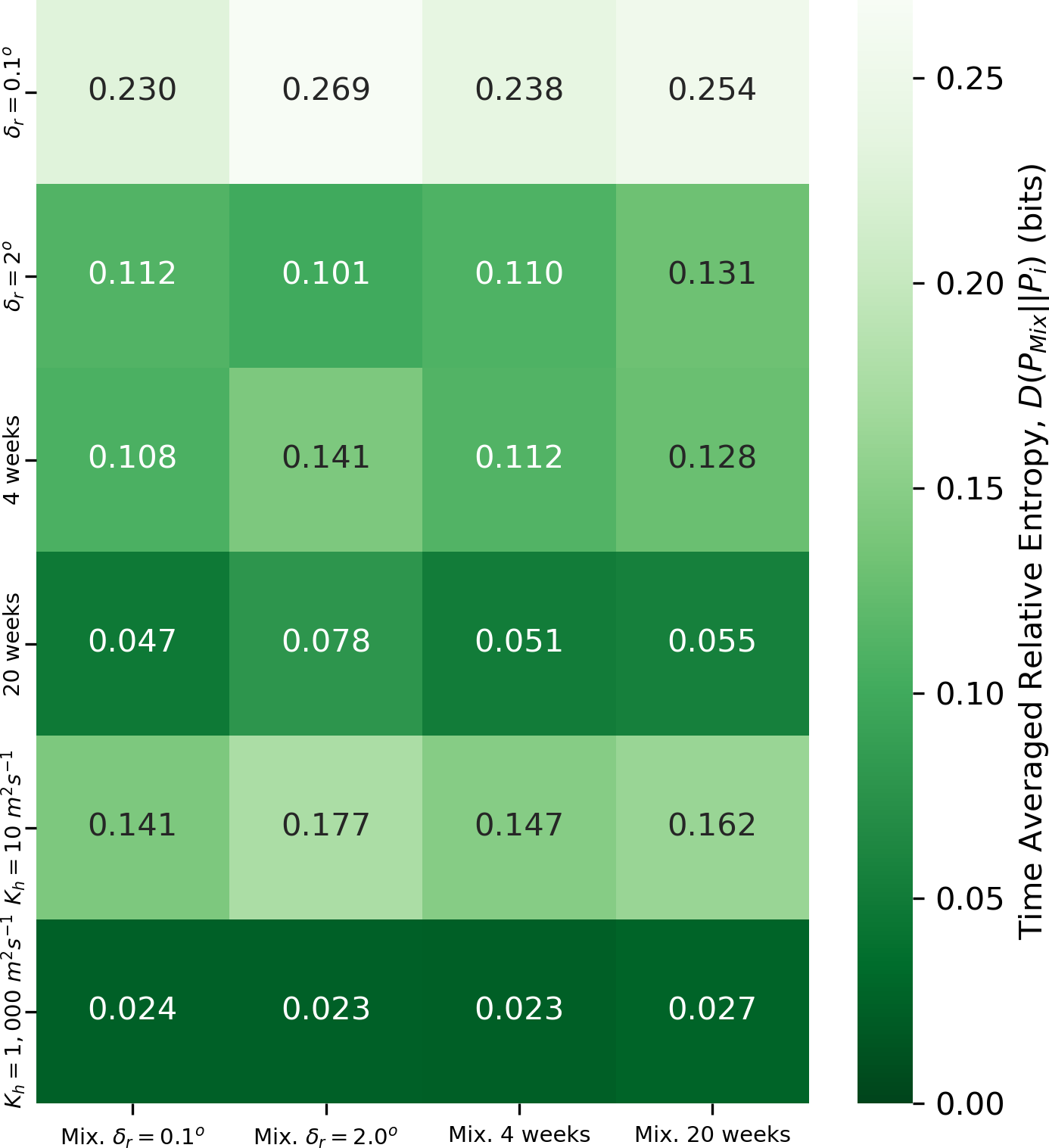 Comparing the 6-year time-averaged relative entropy, shown in Fig. 8, showed how the 20-week release strategy and the Kh=1000 m2 s−1 simulations have least uncertainty and how they represent the best full ensemble variability across different reference mixtures. The δr=2.0° and a 4-week release strategy showed higher uncertainties compared to a 20-week release. Lastly, Kh=10 m2 s−1 and δr=0.1° had the highest time-average relative entropies. This further supports the idea that performing long continuous releases is the best release strategy to generate variability in particle trajectories similar to a full ensemble simulation.
