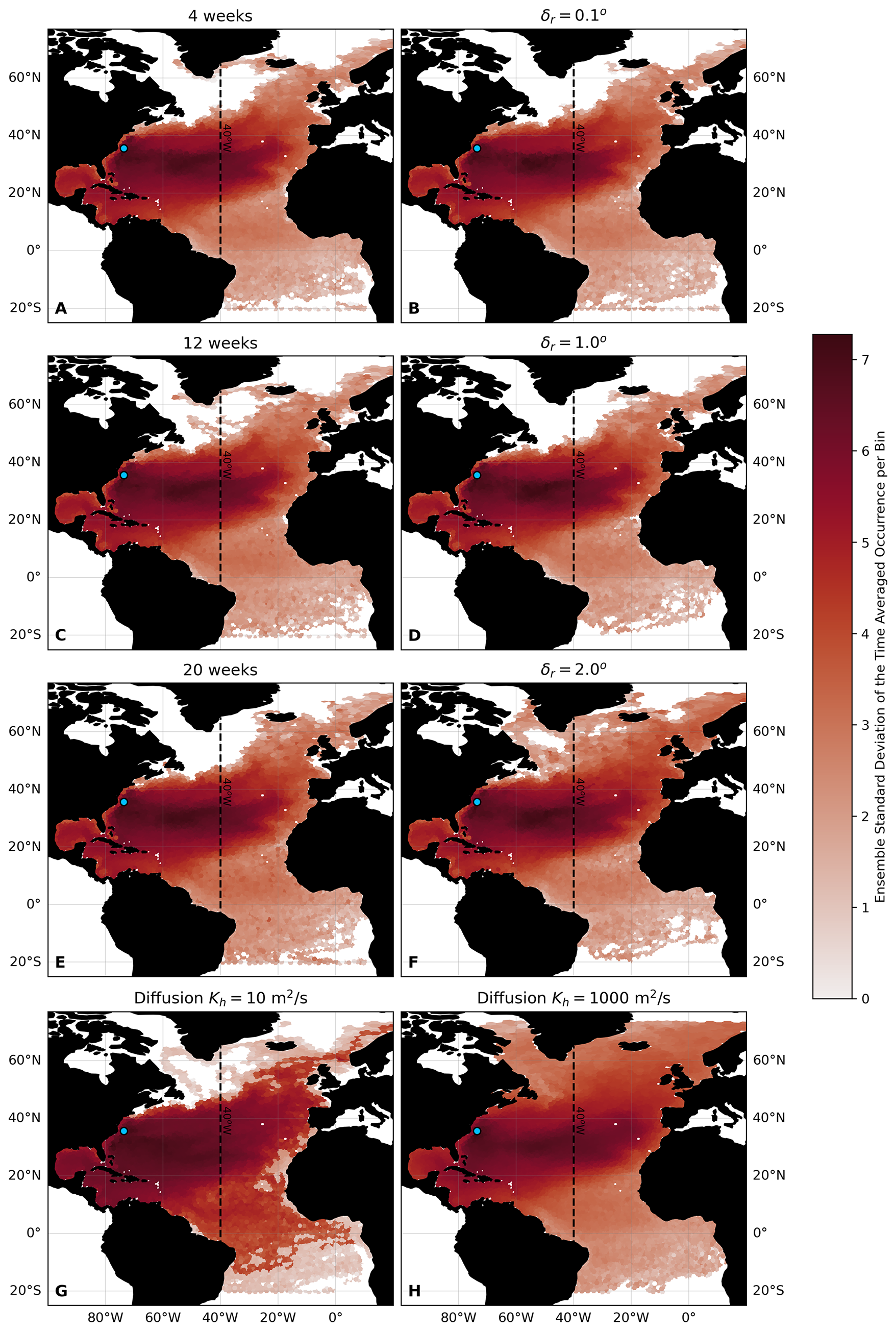 Figure B1Ensemble standard deviation of time-averaged particle occurrence per (hexagonal) bin in the North Atlantic Ocean for single-member simulations. (A, C, E) Temporal release strategies at 4, 12, and 20 weeks. (B, D, F) Spatial release strategies with . (G, H) Diffusion strategies with Kh=10 m2 s−1 and Kh=1000 m2 s−1. The color scale represents the ensemble standard deviation of a 6-year time-averaged occurrence per bin. The maps illustrate the variability in particle dispersal for single-member simulations. The dashed line at 40° W indicates the eastern boundary of the study area. The blue dot marks the approximate release location.