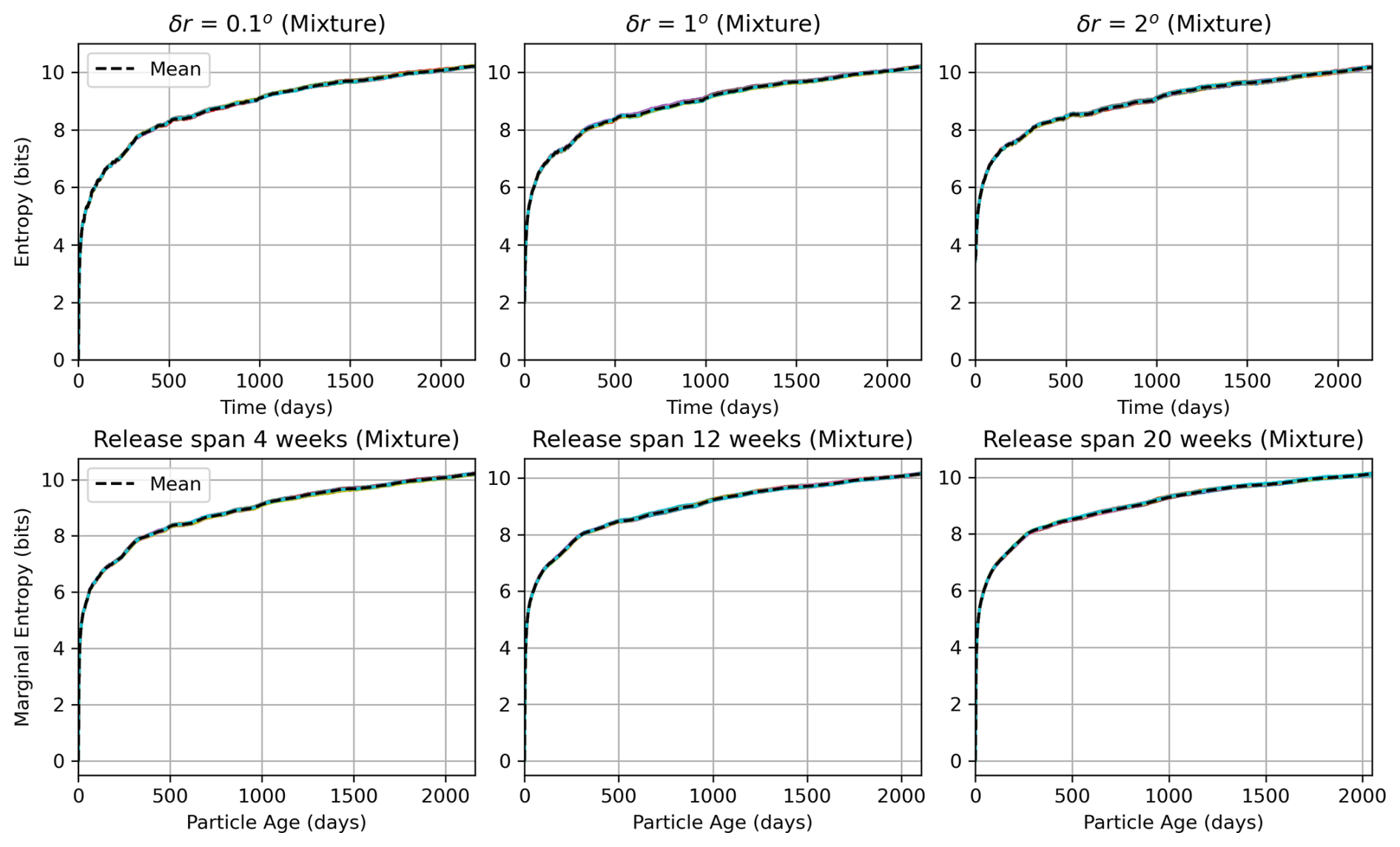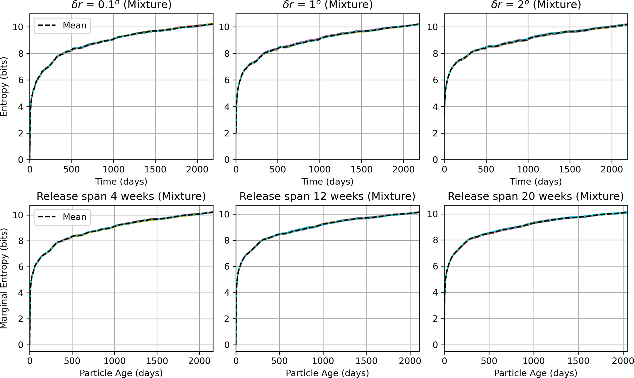 Figure 6A shows the average marginal entropy as a function of particle age for various spatial release strategies, comparing single-member probability distributions (Pm) with mixture distributions (Pmix) using different spatial release intervals (δr). Three single-member curves are shown: δr=0.1° (blue dotted line), δr=1.0° (purple dashed line), and δr=2.0° (green dash-dot line). Two mixture distribution curves are presented: δr=0.1° (solid black line) and δr=2.0° (black dash-dot line). Shaded areas around the single-member curves represent the standard deviation, illustrating the spread of entropy values across the ensemble. There is no shaded area around the mixture entropy curves because their standard deviation was of the order of magnitude 10−2 bits. The logarithmic scale on the x axis emphasizes the rapid changes in entropy during the early stages of particle dispersion. All curves show a logarithmic increasing trend in entropy with particle age, indicating growing dispersion over time. The single-member distributions with larger δr values (1.0 and 2.0°) initially overestimate the entropy compared to the mixture distribution with δr=0.1°, particularly in the first 10 d. After this period, only the single-member distribution with δr=2.0° adequately represents the variability of the mixture with δr=0.1°.