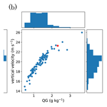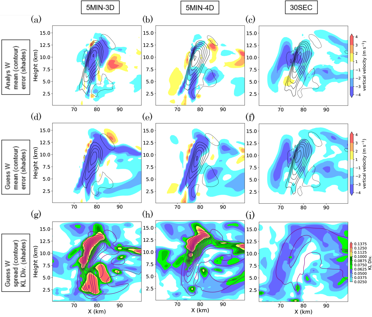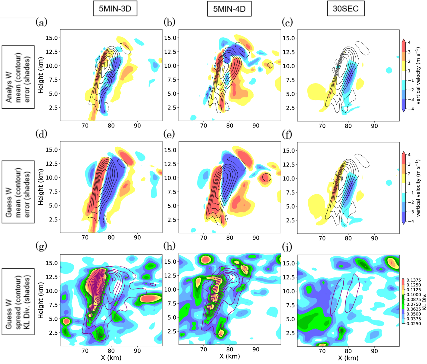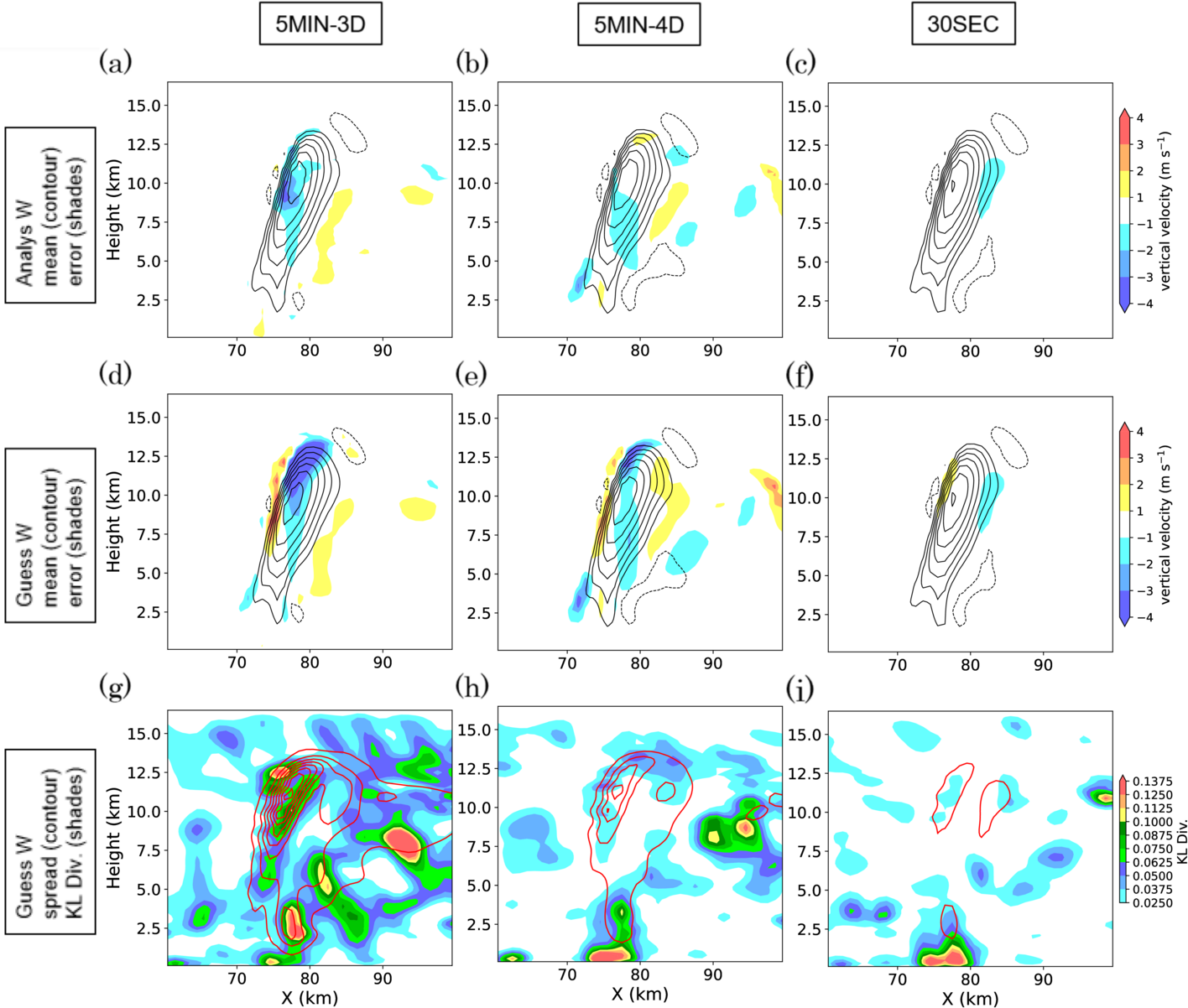 Figure 5g–i show the ensemble spread and the KL divergence in vertical velocity for each case. The case 5MIN-3D shows the largest spread and KL divergence in vertical velocity. The 5MIN-4D shows smaller values, though they are still significantly larger than those of 30SEC. In the case of 5MIN-3D and 5MIN-4D, large values of KL divergence are found near the location of the maximum updraft, the lower troposphere below the updraft, and in the right part of the figures (X= 95 km, Z=8 km). The area below the updraft is thought to be associated with downdraft caused by precipitation in some members, and the right part may correspond to the border of the convective system. However, there are no significant differences of KL divergence around the area of the maximum updraft between 5MIN-4D and 30SEC cases.