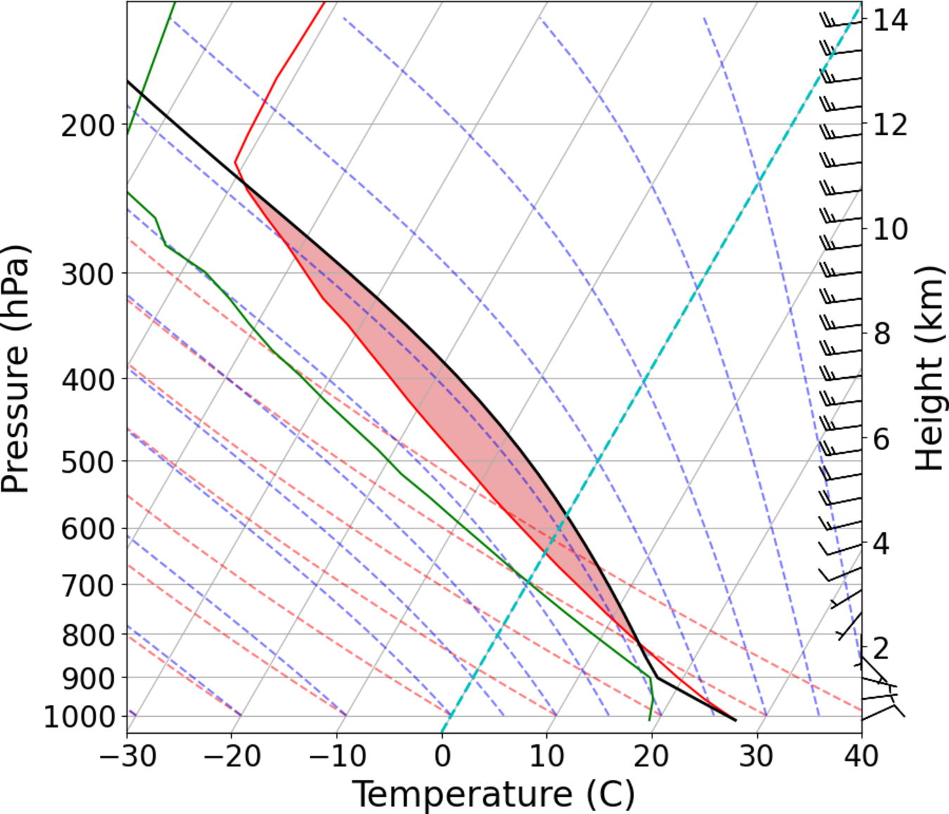 Figure 1A skew-T plot of background atmospheric thermal profile of the experiment. The red shaded area corresponds to the convective available potential energy (CAPE). The profile of horizontal wind is shown on the right side of the figure.