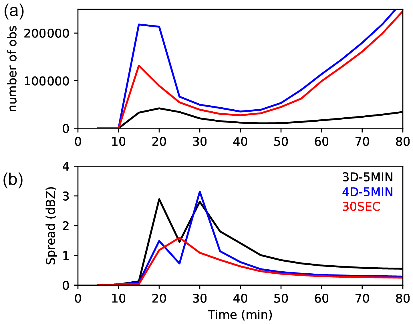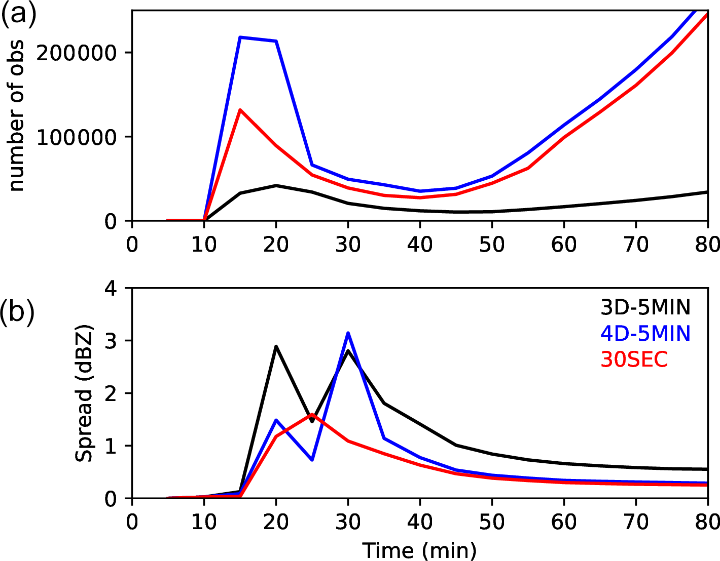 Figure 3Time series of (a) the total number of assimilated observations and (b) the analysis ensemble spread in reflectivity averaged over the grid points where nature run shows values over 10 dBZ. Black, blue, and red curves indicate the results of 5MIN-3D, 5MIN-4D, and 30SEC, respectively.
