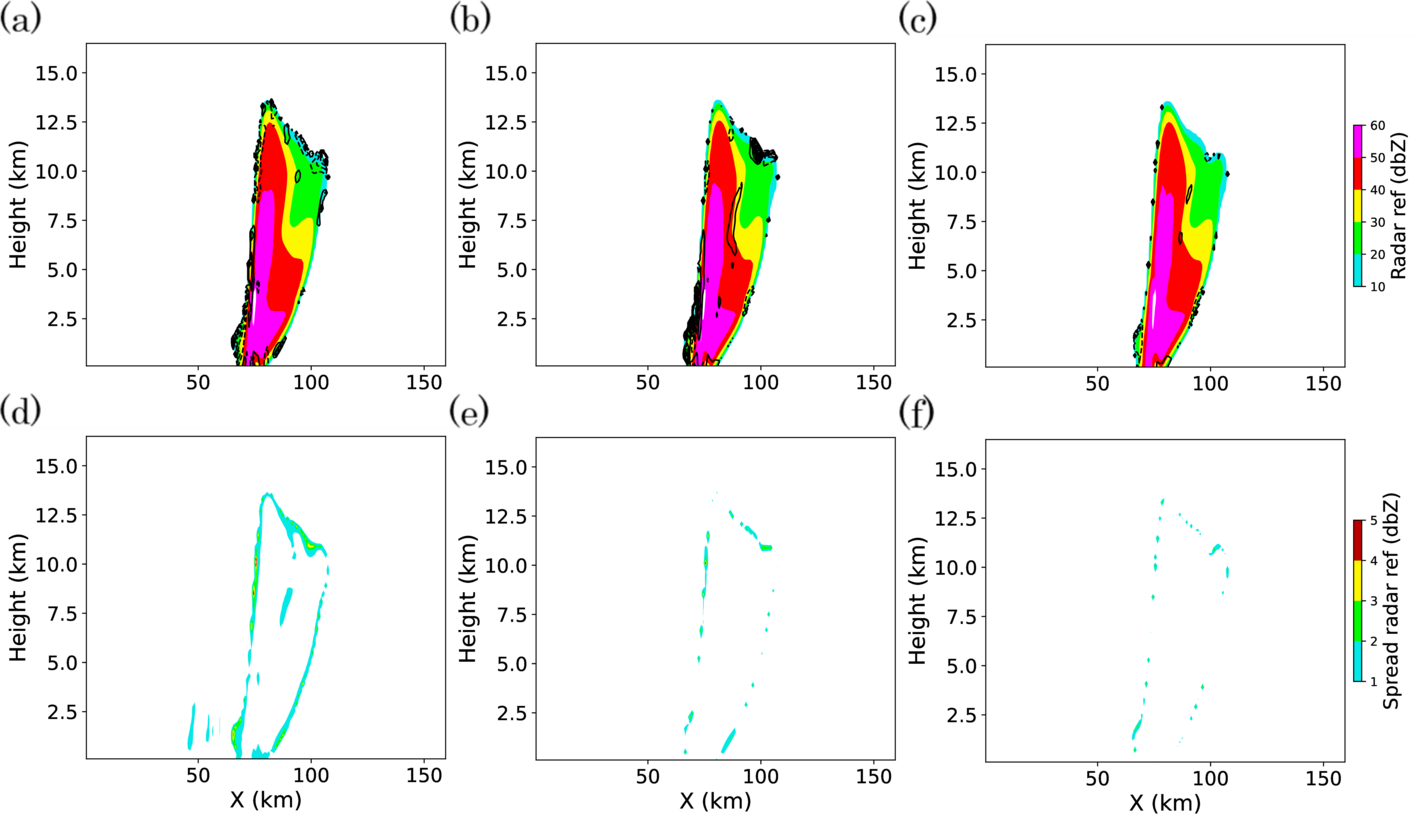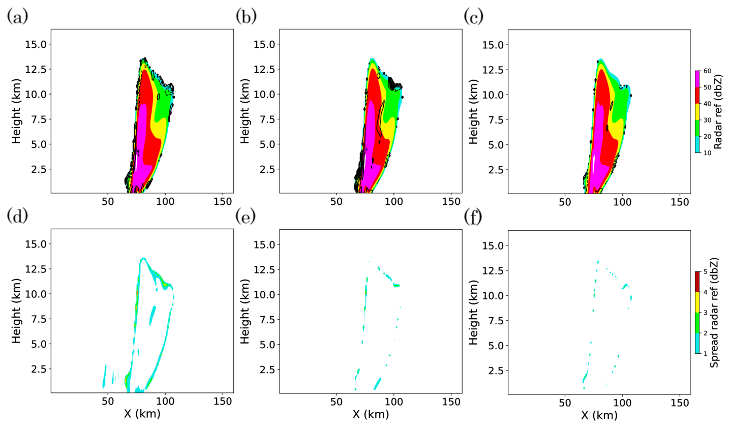 Figure 4Vertical cross sections of (a–c) ensemble mean and (d–f) spread of analysis reflectivity at 00:50:00, for (a, d) 5MIN-3D, (b, e) 5MIN-4D, and (c, f) 30SEC cases respectively. Black contours in (a)–(c) indicate the difference between analysis mean and nature run, with contour interval of 0.5 dBZ.