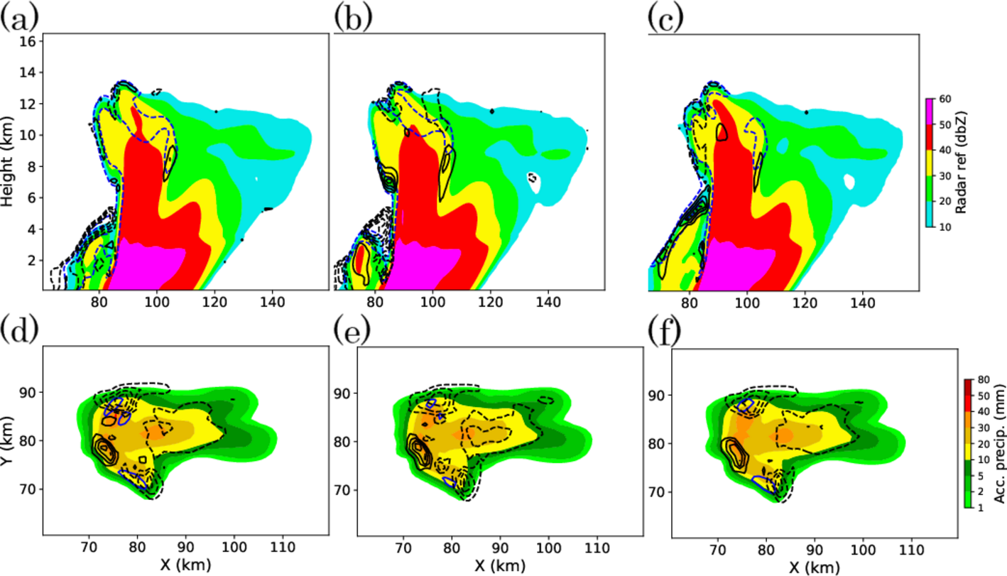 Figure 6(a–c) Vertical cross sections at Y= 80 km of ensemble mean radar reflectivity and (d–f) ensemble mean accumulated surface precipitation of 30 min forecast from 00:50:00. They are of (a, d) 5MIN-3D, (b, e) 5MIN-4D, and (c, f) 30SEC cases respectively. Black contours in (a)–(c) indicate difference from the nature run with a contour interval of 5 dbz. Black contours in (d)–(f) indicate the difference from the nature run with a contour interval of 2 mm. Blue contours in (a)–(c) indicate the ensemble spread in reflectivity with a contour interval of 5 dbz. Blue contours in (d)–(f) indicate the ensemble spread in surface precipitation with a contour interval of 2 mm.