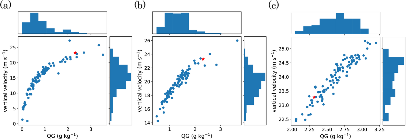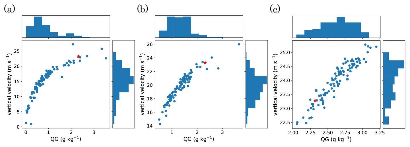 Figure 7The examples of scatter plots of 100 ensemble members between graupel mixing ratio (QG) and vertical velocity (W) for each of (a) 5MIN-3D, (b) 5MIN-4D, and (c) 30SEC cases, at 00:50:00 as in Fig. 5. The blue dots indicate values of each ensemble member. The red star marker indicates the value of nature run. Histograms of QG and W are shown on the top and on the right of each panel, respectively.