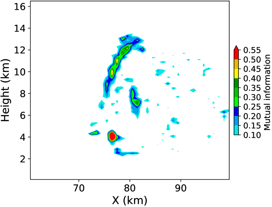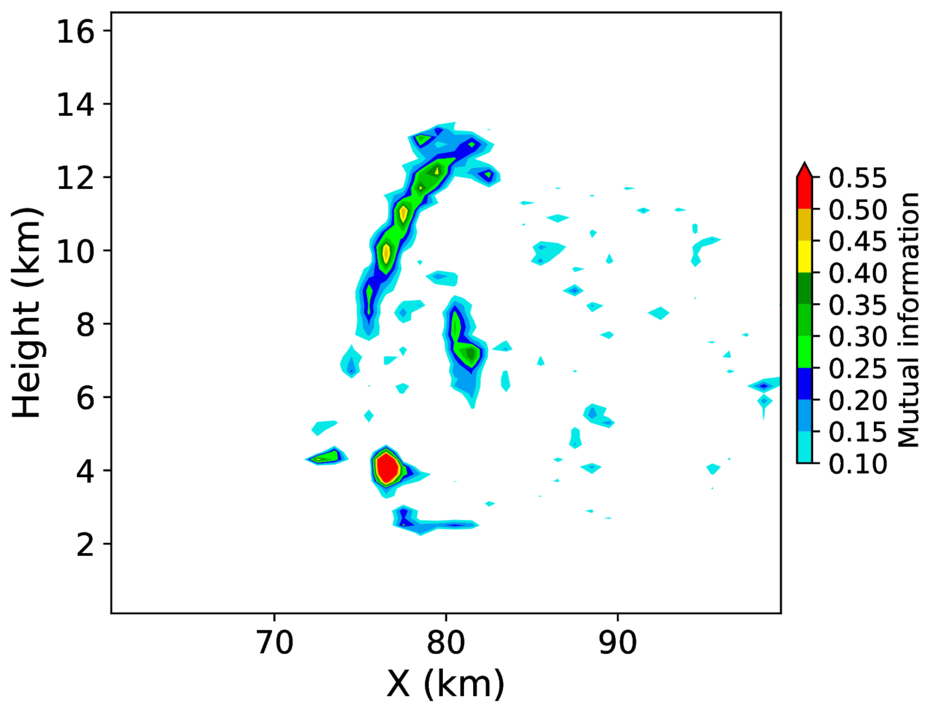 In this section, we examine the error probability distribution and discuss how it impacts on analysis accuracy. Figure 7 shows the example scatter plots between first guess ensemble of graupel mixing ratio and vertical velocity for each case. The blue markers correspond to the values of each of the 100 ensemble members, indicating the joint probability distribution, and the red markers indicate the nature run. They are extracted from the same grid point (X= 78 km, Y= 80 km, Z= 12.1 km), where the 5MIN-3D case shows large KL divergence of vertical velocity. The 5MIN-3D case shows the joint distribution with a bended shape, whereas the 5MIN-4D and 30SEC cases show the distribution that would be more fitted by a straight line. This is due to the difference in the ensemble spread as seen in Fig. 5d–f. The rapid error growth produces not only the non-Gaussianity in a single variable but also the nonlinearity in cross-variable relationships in the first guess ensemble. This may be the cause of the analysis error in state variables, as the LETKF calculates the analysis increment using the linear superposition of the ensemble perturbation of the first guess. That treatment is unable to estimate the optimal analysis increment value for both of the two variables when they have a nonlinear functional relationship. To quantify the occurrence of the joint distribution showing nonlinear relationship such as Fig. 7a, we calculate the mutual information between the ensemble members of graupel and vertical velocity at every grid point, after removing the linear dependency. Figure 8 shows the cross section of the mutual information. Large values are found in the upper part of the main convective cell in the 5MIN-3D case, indicating strong nonlinear relationship between the two variables. This tendency of a strongly nonlinear joint distribution between the graupel mixing ratio and the vertical velocity may be one of the factors which contribute to the larger error in analysis mean vertical velocity in Fig. 5a. This approximately nonlinear relationship, as well as large ensemble spread in first guess vertical velocity itself, can introduce suboptimal analysis increment.