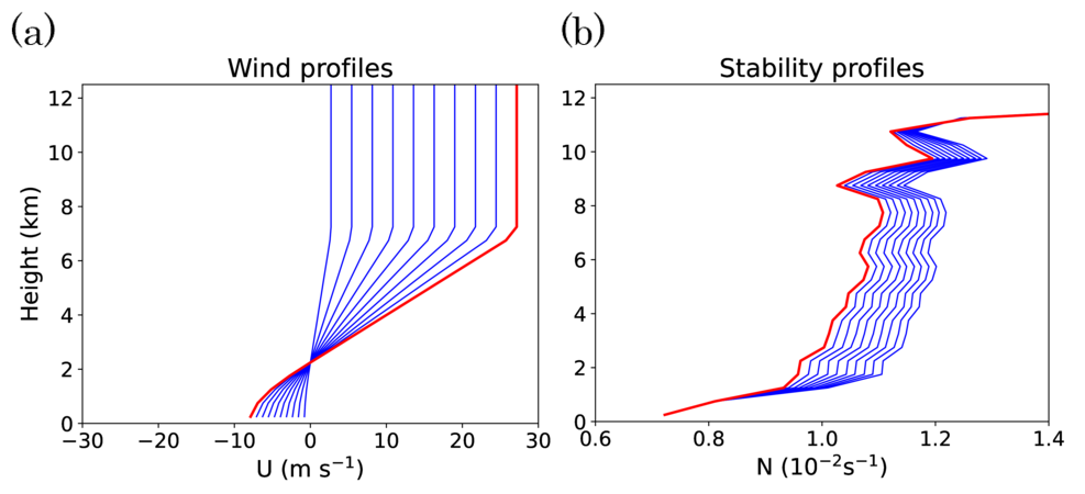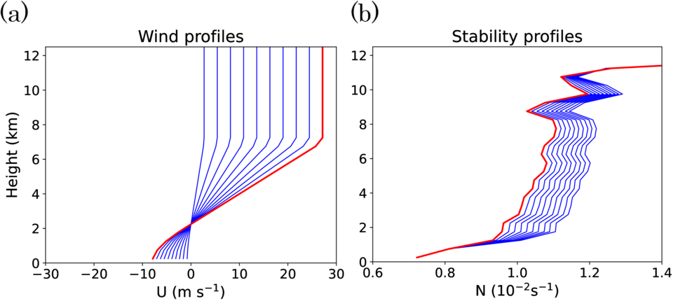 Figure 9Background atmospheric profiles of (a) horizontal wind and (b) atmospheric stability (buoyancy frequency) used in the experiment in Sect. 4. Each panel shows 10 different profiles, which are randomly assigned to the initial condition of 100 members. Red curves indicate the profiles used for the nature run.