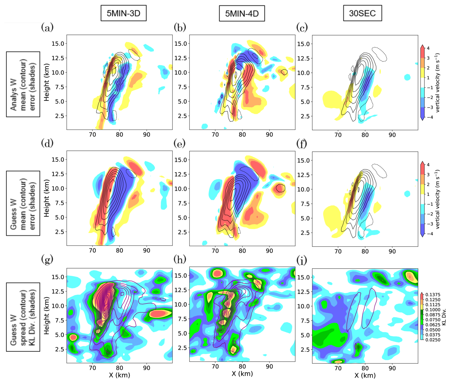 Figure 5Vertical cross sections at Y= 80 km of (a–c) analysis ensemble mean and deviation from the nature run, (d–f) first guess ensemble mean and deviation from the nature run, and (g-i) first guess ensemble spread and KL divergence, of vertical velocity at 00:50:00, for (a, d, g) 5MIN-3D, (b, e, h) 5MIN-4D, and (c, f, i) 30SEC cases respectively. Black contours in (a)–(f) indicate ensemble mean of vertical velocity with contour interval of 5 m s−1. Red contours in (g)–(i) indicate first guess ensemble spread of vertical velocity with contour interval of 0.5 m s−1.