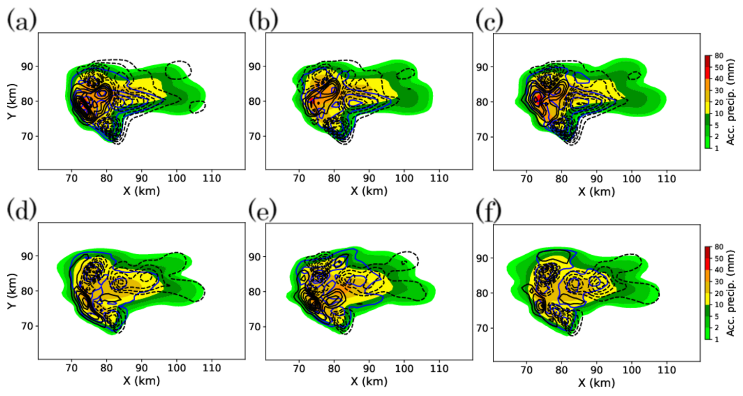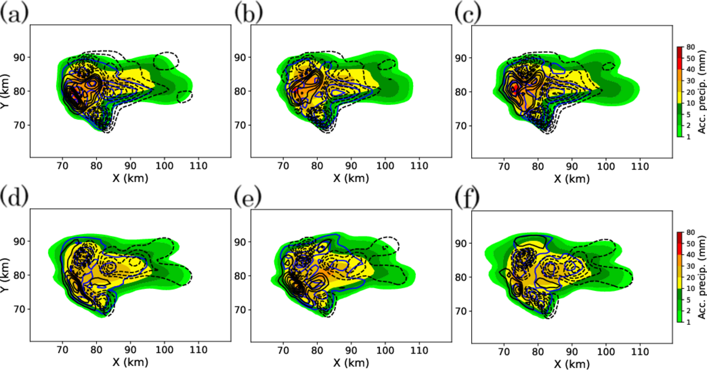Figure 12Ensemble mean 30 min accumulated surface precipitation of forecasts from 00:50:00, of the experiments with (a–c) background wind and (d–f) background stability perturbation. They are of (a, d) 5MIN-3D, (b, e) 5MIN-4D, and (c, f) 30SEC cases respectively. Black contours indicate the difference from the nature run with a contour interval of 2 mm. Blue contours indicate the ensemble spread in surface precipitation with a contour interval of 2 mm.