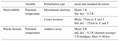 Second, we study the ideal case of a single deep convection triggered by a warm bubble in a conditionally unstable atmosphere. This simplifies the causal relationship between the evolutions of hydrometeors and winds. This causal relationship is often complex with multi-scale interactions in the real world. In addition, we assume only convective-scale uncertainty in the initial ensemble by perturbing only warm bubbles while using the same vertical profiles for the initialization of each member.