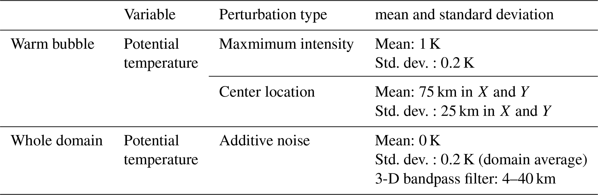 The design of initial ensemble perturbation is crucially important for the data assimilation with the LETKF, as it largely determines the characteristics of the multi-scale and multi-variable background error covariance. In this study, as mentioned above, we simplify the problem by setting the idealized initial perturbation. We use the same vertical profile with that of the nature run, to initialize the state variables of all the members. We perturb the location and intensity of the warm bubble, with a spatial scale comparable to the size of the convective cell. Further, we add the small random band-pass-filtered potential temperature perturbation over the entire domain to create the non-zero ensemble spread in the area outside the convective cell. With these initial perturbations, the first guess ensemble at the time when high reflectivity is first observed is expected to have strongly non-Gaussian perturbations with a spatial structure at a convective scale. The parameters used for these perturbations are summarized in Table 1.