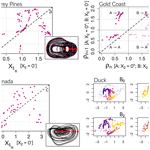 For the 3 models, the (X2–X1) portrait is the typical projection of a differential phase space involving an observable and its first-order derivative (Fig. 3). In such a representation, the shape of the trajectory reflects the underlying restoring and dissipative mechanisms of the system. The attractors observed here indicate a combination of 2 oscillatory processes in which shoreline position (X1) oscillates around a single equilibrium point for Torrey Pines and Ensenada, under the restoring action of sandbar-mediated feedbacks and the cyclicity imposed by the annual cycle. For Gold Coast, the attractor evolves around 2 equilibrium points (located close to () and (1,0) in the (X1,X2) projection), and a third one situated between them (close to (0,0)), which enables alternation between the 2 equilibria or the emergence of larger loops connecting them. The amplitude of the loops provide insight into the system's stability and rate of energy exchange. Extended, large-amplitude loops indicate stronger seasonal variability and larger-scale shoreline adjustments, whereas numerous smaller, short-lived loops reflect disruptive short-term events (e.g., storms, intra-seasonal variability). The amplitude of these smaller loops further reveals the system's capacity to damp the morphological imprint of such disturbances, thus reflecting its resilience. At Torrey Pines, the observational data (red within Fig. 3) exhibit wide, extended loops involving 2 main branches, indicative of a highly energetic system dominated by strong seasonal variability and pronounced morphological exchanges. The numerous more rounded shorter loops suggest a superimposed contribution of storm-scale fluctuations. The model reproduces the overall extent of the attractor, capturing the main envelope of variability and the large-scale cyclic behavior, but with smoother trajectories, implying that part of the short-term perturbations and their damping–recovery dynamics are smoothed (i.e. high dimensional dynamics associated with noise has been filtered). The dynamical complexity observed at Torrey Pines ultimately converges to a period-two cycle, suggesting a metastable chaotic regime that may be triggered by temporary variations in the system (e.g. tides, mesoscale eddies, coastal storms). In contrast, at both Gold Coast and Ensenada, the model successfully reproduces the occurrence of both small and large loops, suggesting a more representative behavior across the system's spatiotemporal scales. The (X3–X2) projection highlights the joint variability between sandbar position and shoreline rate of change, reflecting the co-evolution of both components within the same morphodynamic feedback loop. The sandbar position (X3) encapsulates the system's longer-term adjustment to hydrodynamic conditions, while the shoreline rate (X2) expresses the more immediate response of the beach. The attractor geometry thus encompasses the phase relationship between these 2 timescales (making it the less evident projection to interpret only through observations). At Torrey Pines, Gold Coast and Ensenada, the trajectories form elongated, looping structures, indicating that sandbar migration and shoreline motion are phase-shifted, with delayed recovery of the shoreline once the sandbar returns landward. This reflects a coupled oscillatory system where energy is alternately stored in sandbar migration and released through shoreline adjustment. Therefore, these portraits reveal the mutual, rather than unidirectional, influence between the sandbar and shoreline components of the system for all 3 sites.