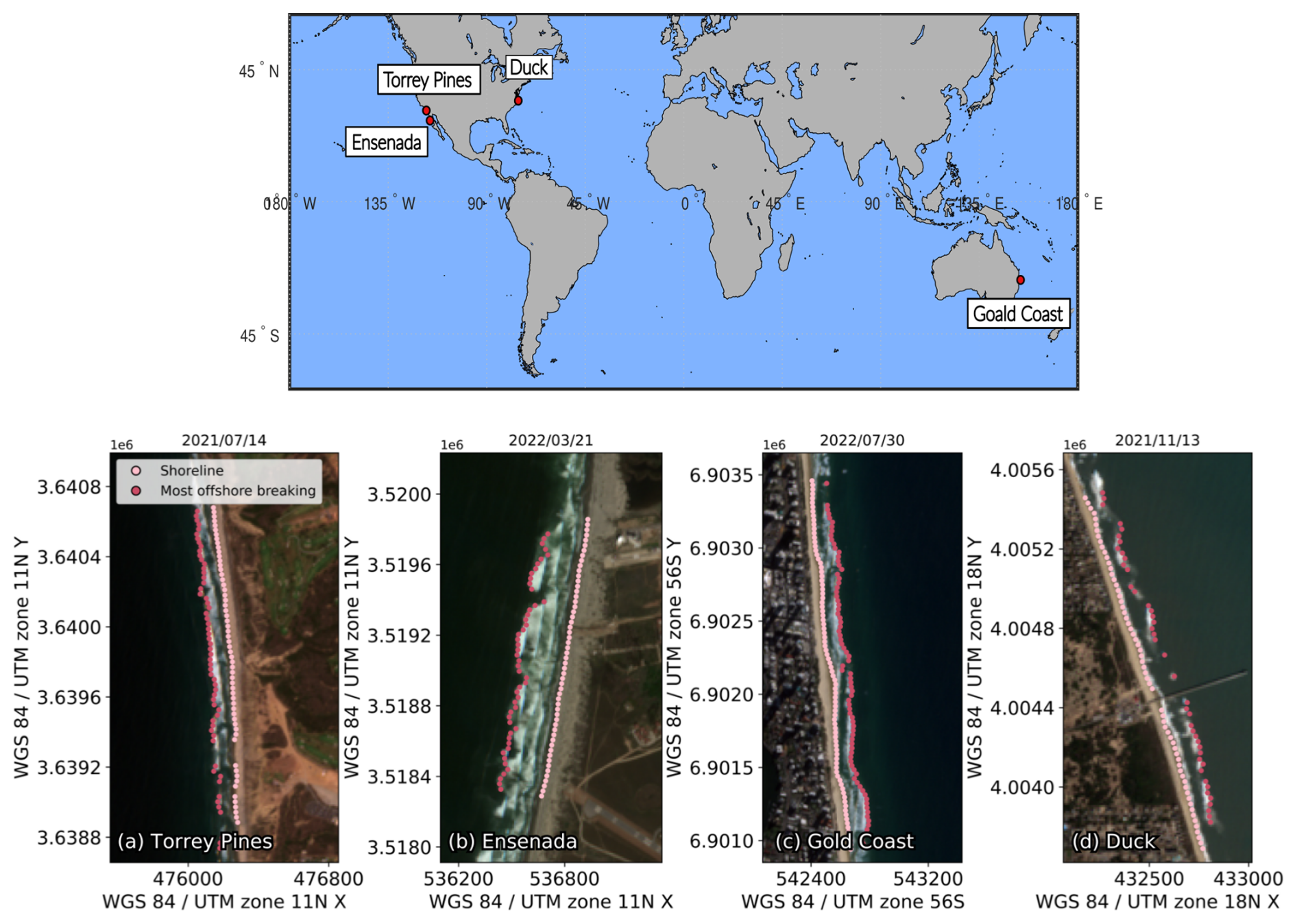 Figure 1 shows the geolocation of the 4 sites along with Sentinel-2 images highlighting the detection of the shoreline (xs, light pink) as well as the submerged active sandbar (xb, offshore breaking, dark pink) along the transects for each beach on a specific date.