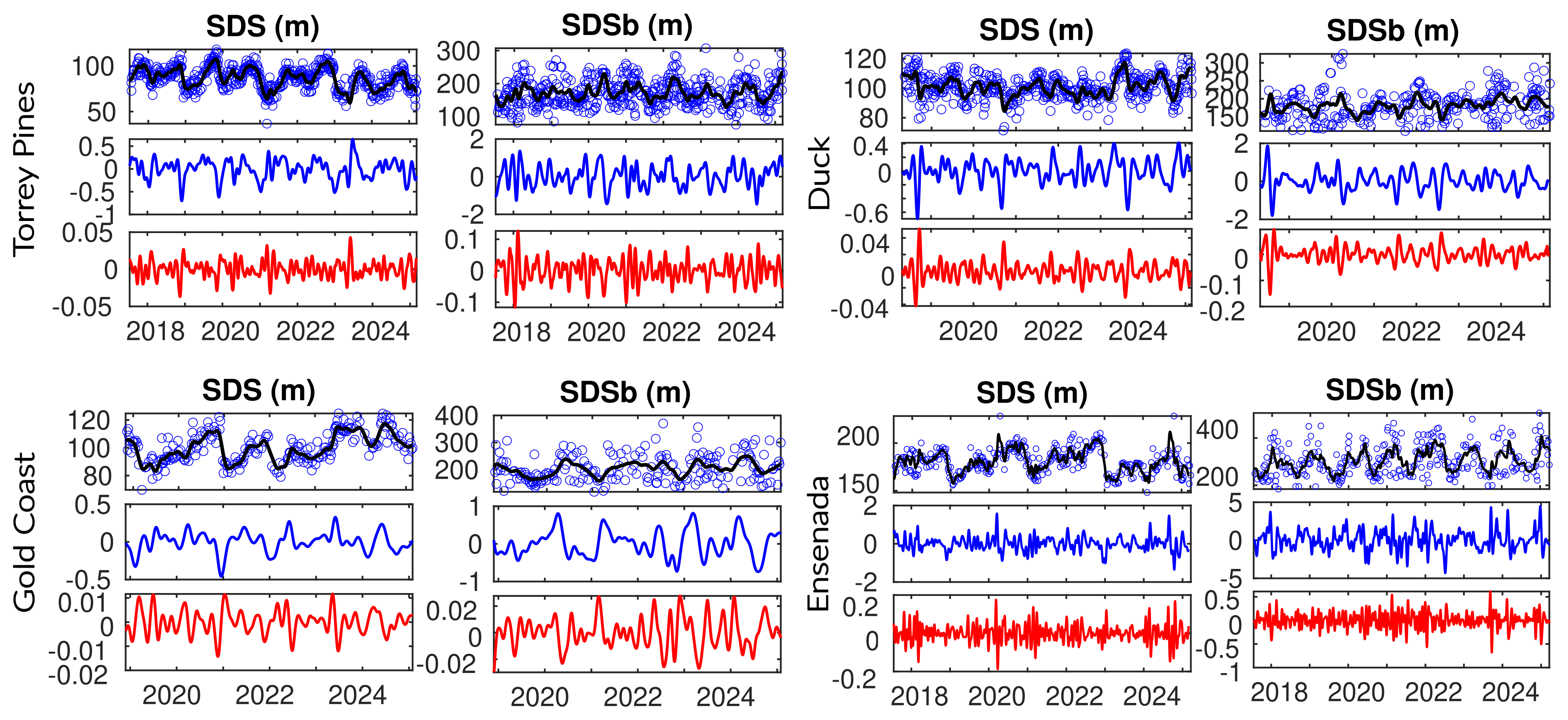 Figure 2Study sites time-series overview. Satellite-derived shoreline (SDS) and nearshore sandbar (SDSb) time series and their first- and second-order temporal derivatives (blue and red, respectively) for the 4 study sites: Torrey Pines (USA), Gold Coast (Australia), Ensenada (Mexico) and Duck (USA). Raw daily observations (blue dots) and smoothed trajectories (black lines) are shown together with the corresponding time derivatives computed using a Savitzky–Golay filter.