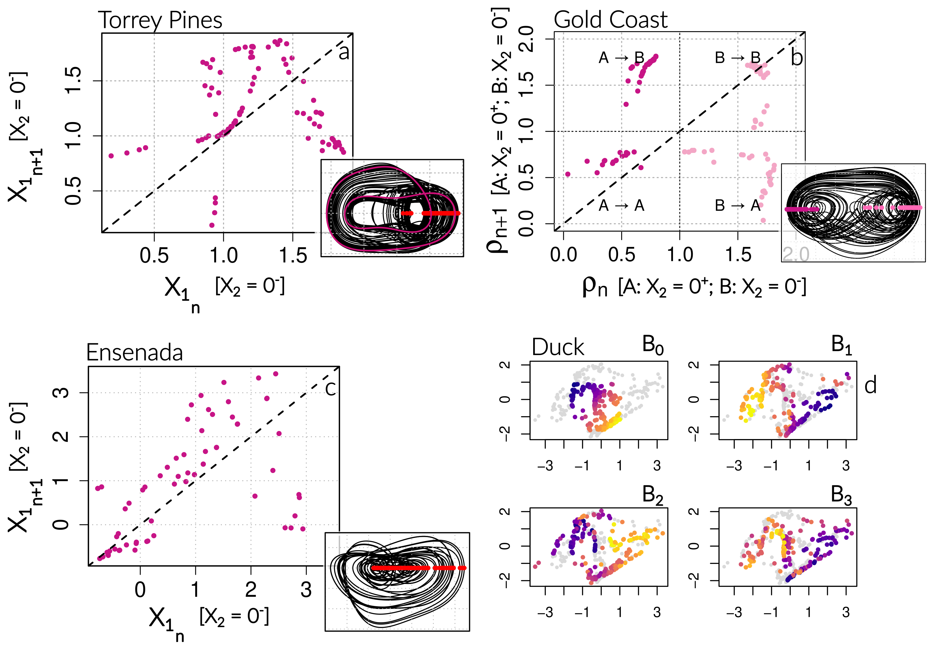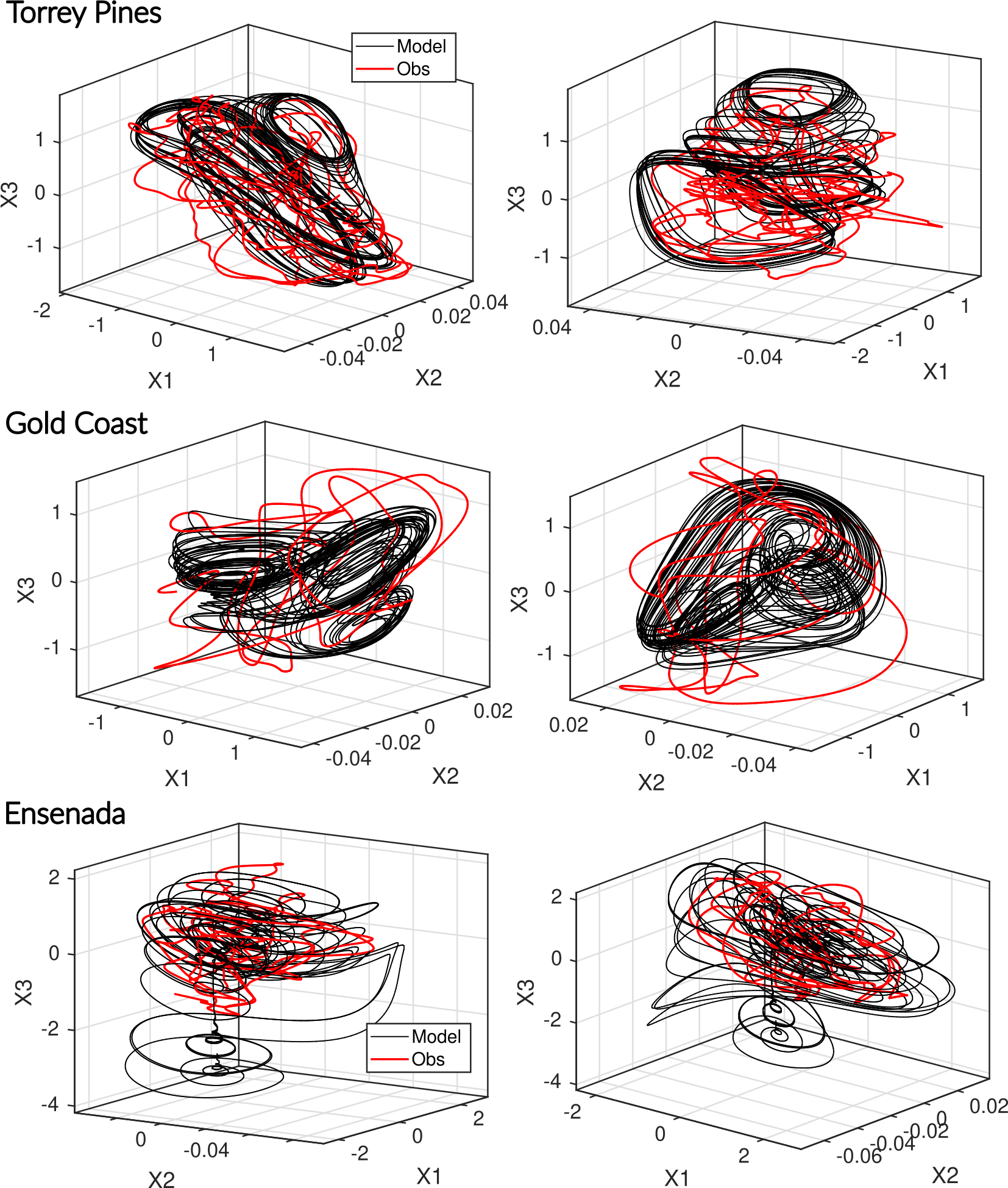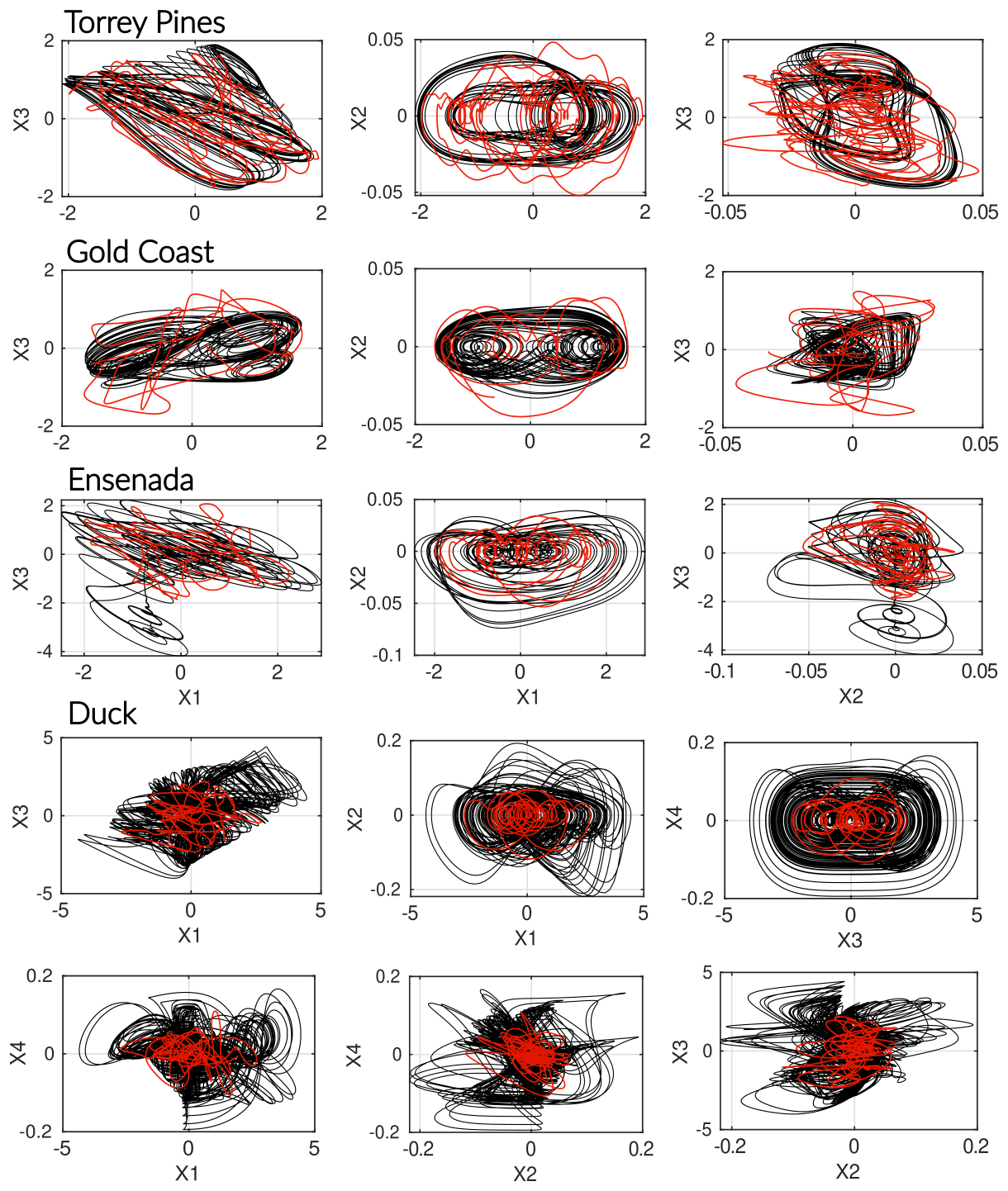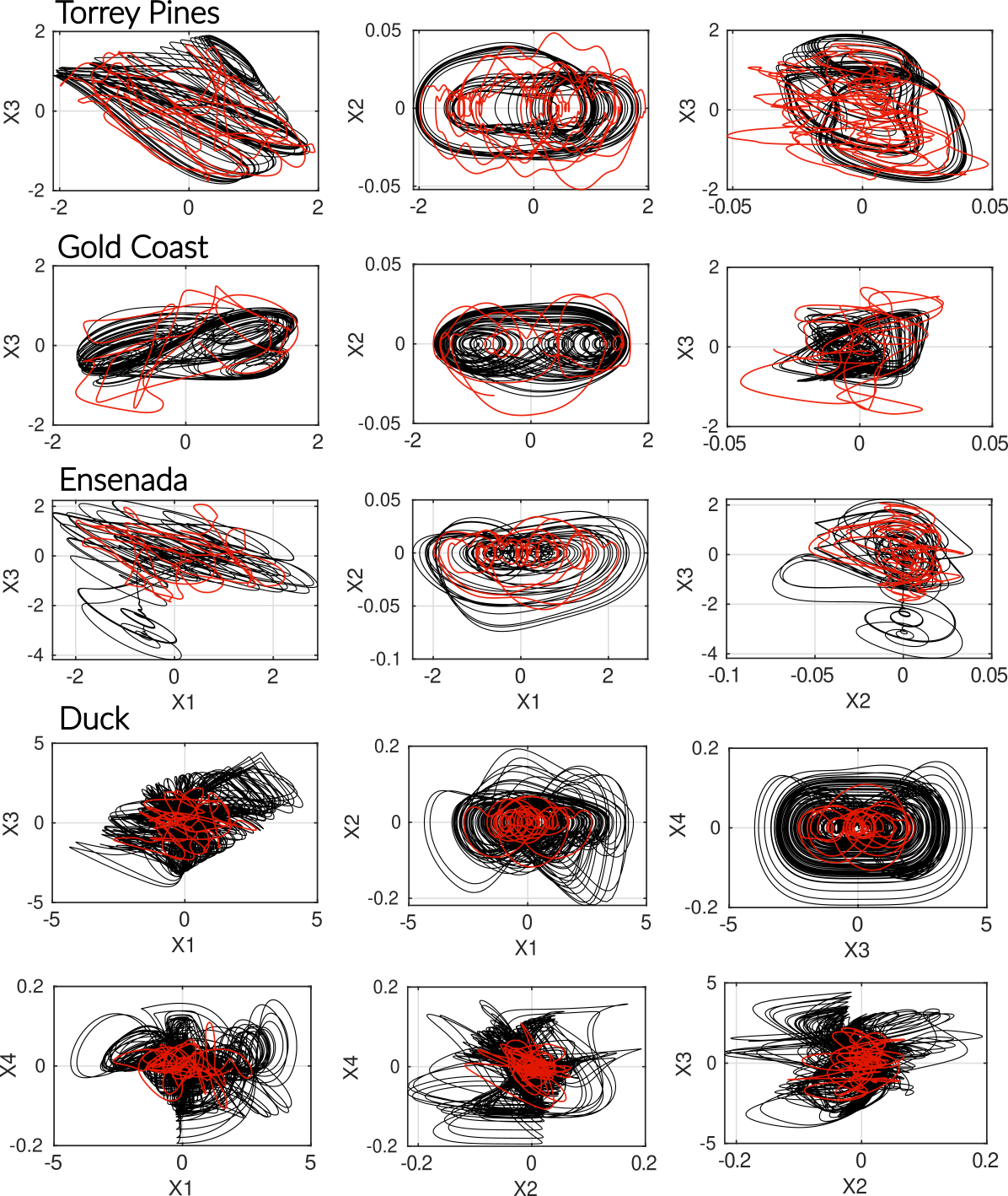 Figure 3Comparison of observed (red) and modeled (black) phase spaces. For the three-dimensional models (Gold Coast, Torrey Pines, Ensenada), each portrait of the reconstructed attractor is shown. All systems exhibit a coherent shoreline–sandbar (X1–X3) coupling, with a clear negative linear relationship in Torrey Pines and Ensenada, whereas Gold Coast displays an inverted correlation pattern at seasonal scale. The four-dimensional model (Duck) reveals a markedly more intricate structure, characterized by strong nonlinear interactions among variables and the absence of any simple linear dependency between shoreline and sandbar positions (X1–X3). The inferred GPoM models successfully reproduce site-specific attractors and capture the essential geometry of the underlying morphodynamic phase space.