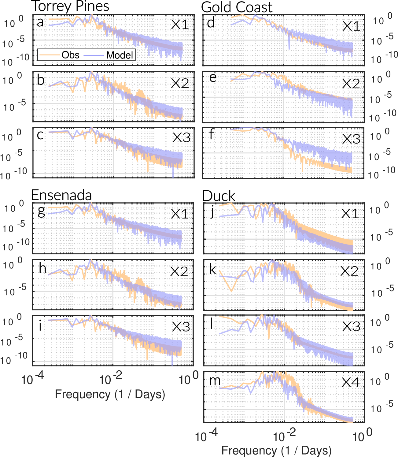 Figure 4Comparison of normalized spectral power density between observations and models. Each variable's spectrum obtained from the model (light purple) is plotted against its corresponding observation (light orange). The modeled energy distribution closely matches that of the observed data, indicating that the models successfully reproduce the dynamical variability of the systems they were inferred from. At low frequencies (10−4–10−3 d−1), the slow components of the shoreline–sandbar system are well captured, reflecting a realistic long-term memory and morphodynamic coupling. The model also reproduces the seasonal to monthly dynamics (around 10−2 d−1) with good accuracy. At higher frequencies (> 10−2 d−1), the energetic slope remains consistent between model and observations, without overestimation of short-term variability, suggesting that the GPoM-based dynamics naturally filter the high-frequency noise while preserving the dominant physical scales of variability. The broadband power-law spectra () indicate that the shoreline–sandbar system exhibits long-term memory and self-organized, chaotic dynamics, with energy cascading smoothly from low-frequency morphodynamic cycles to higher-frequency storm-driven responses.