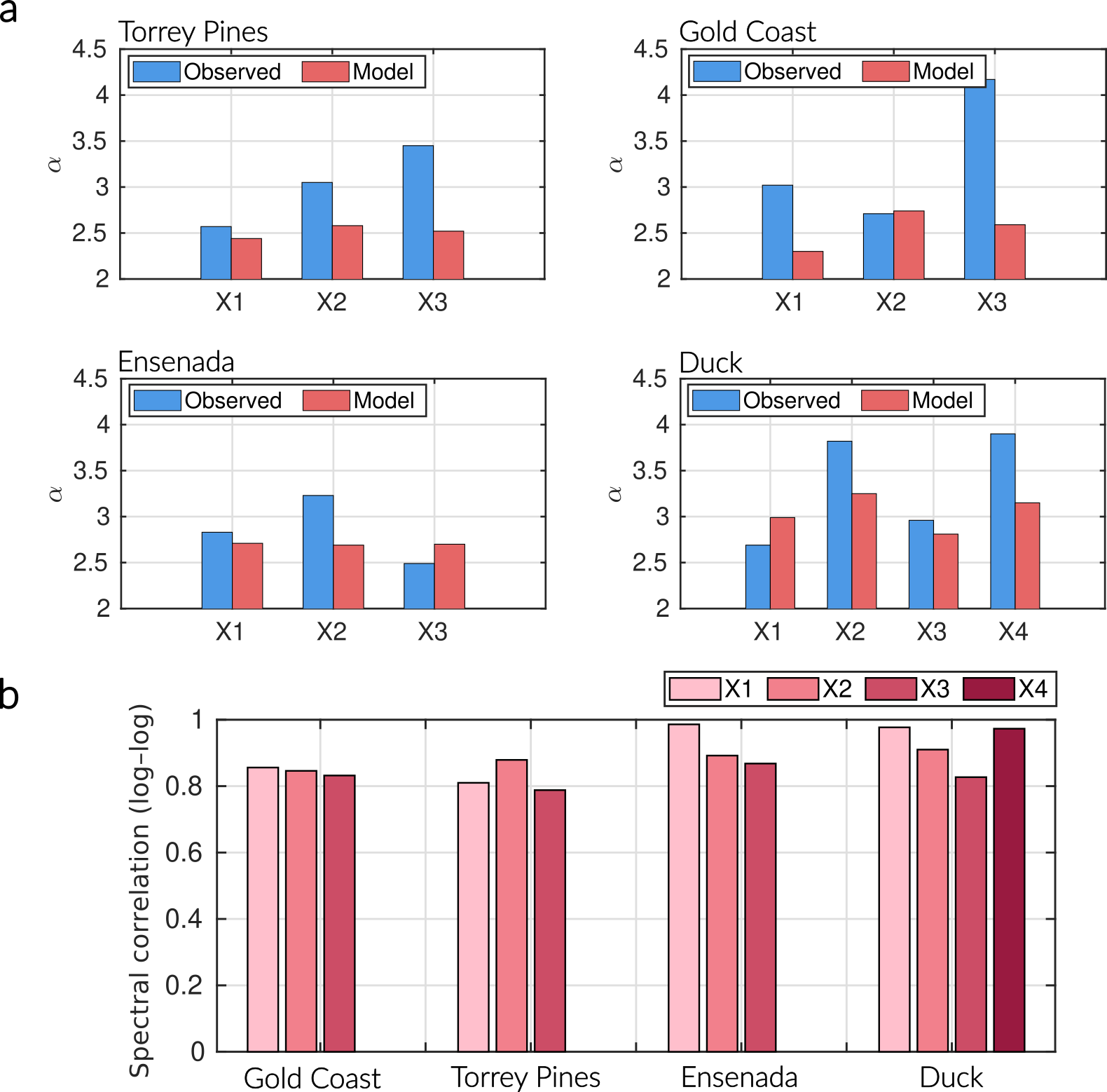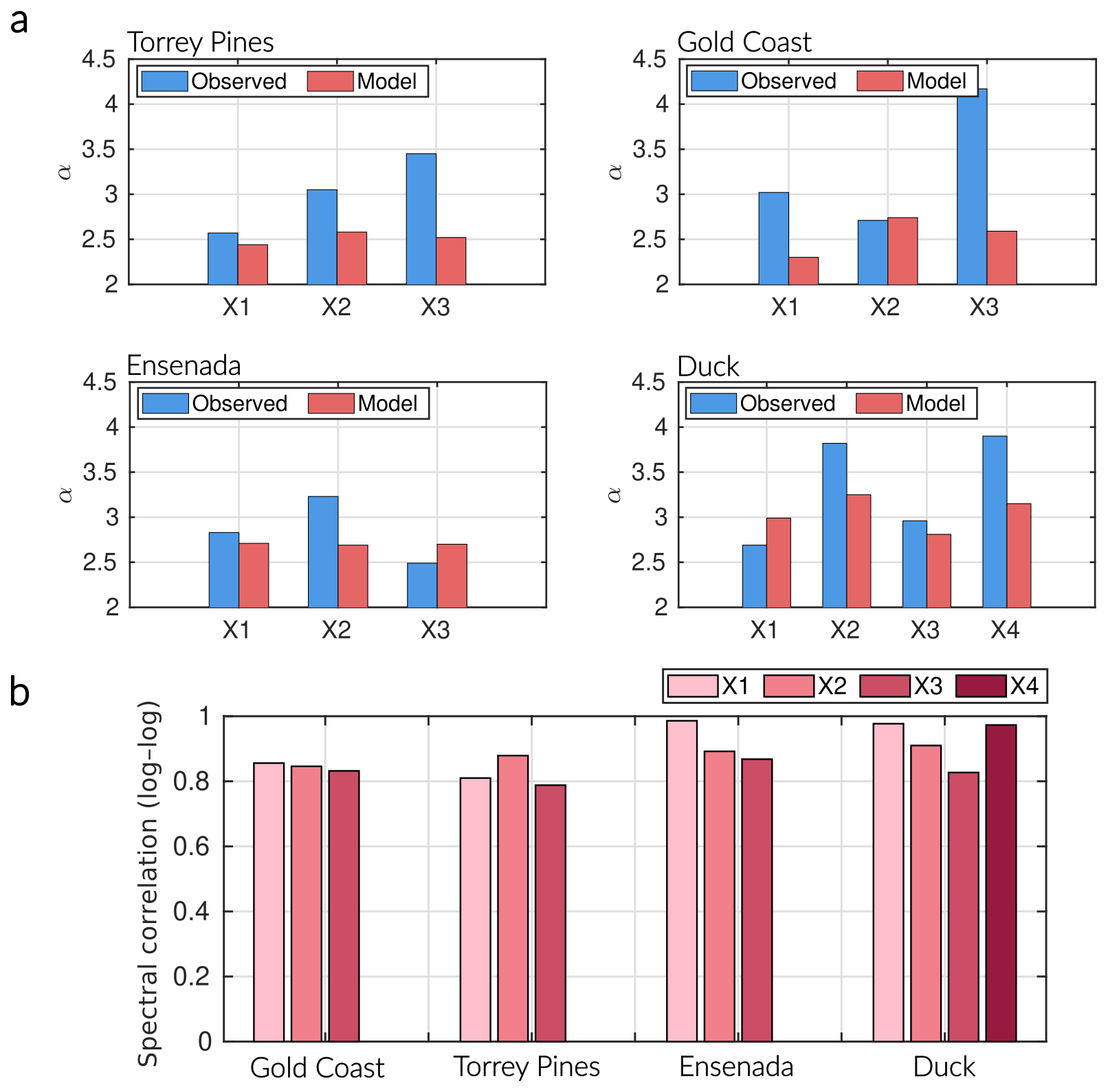 Figure 5Spectral comparison between observed and modeled dynamics. (a) Comparison of spectral slopes (α) for each variable and site. Both observations (blue) and GPoM models (red) exhibit red-to-brown noise behavior (α≈ 2.5–4), indicating scale-invariant, long-memory morphodynamic variability. (b) Spectral correlations (log–log) between observed and modeled spectra show consistently high values (r > 0.8), confirming that the inferred nonlinear dynamics reproduce the observed energy distribution across temporal scales. The GPoM models capture both the scaling and spectral energy structure of the shoreline–sandbar systems, reflecting a realistic transfer of energy from low-frequency morphodynamic oscillations to higher-frequency storm-driven variability.
