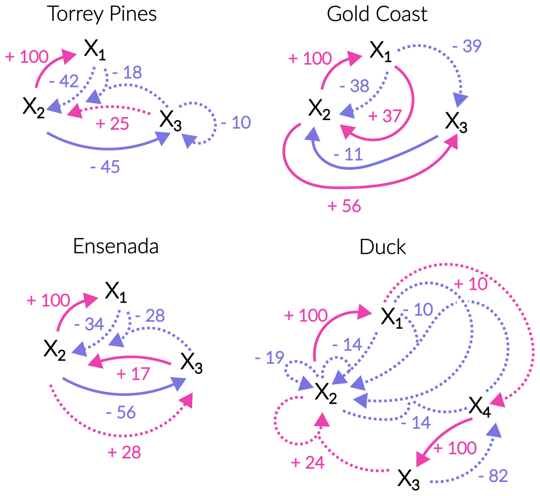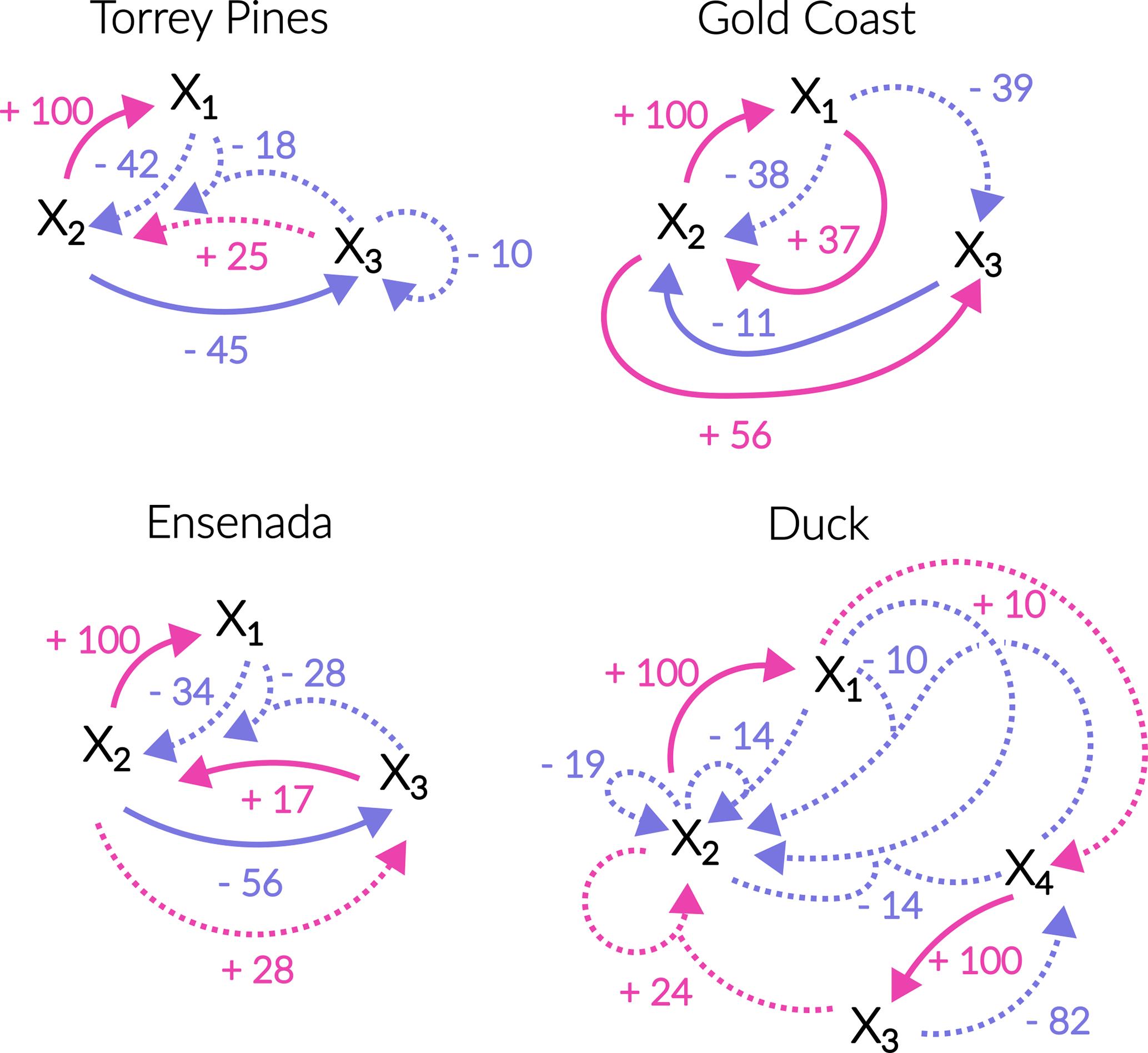Figure 6Fluence diagrams between the variables for the 4 sites. Fluence diagrams are presented to map the underlying positive (pink) and negative (light blue) feedback loops between variables, whether linear (solid lines) or nonlinear (dashed lines). The strength and sign of the feedback influence is derived directly from the variance explained by each term within its equation (Tables 2–5) and the sign of the associated coefficient (Table 1), respectively. Only terms accounting for 10 % or more of the signal variability are considered. Note that to account for the combined action of several variables, arrows with 2 inputs and a single output are used.