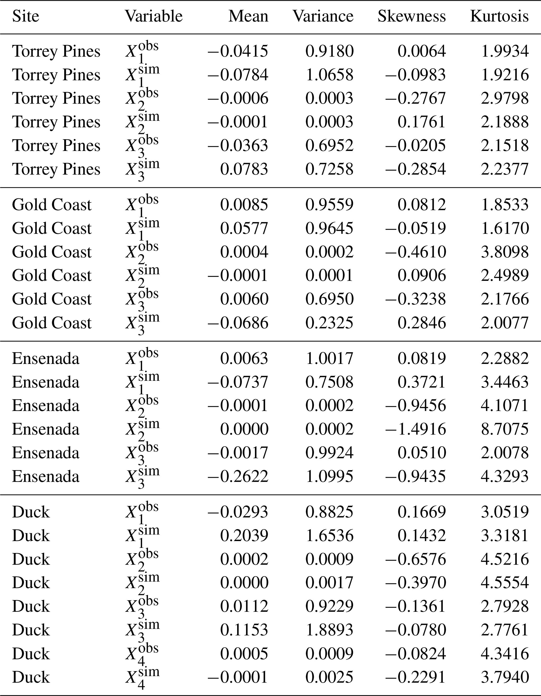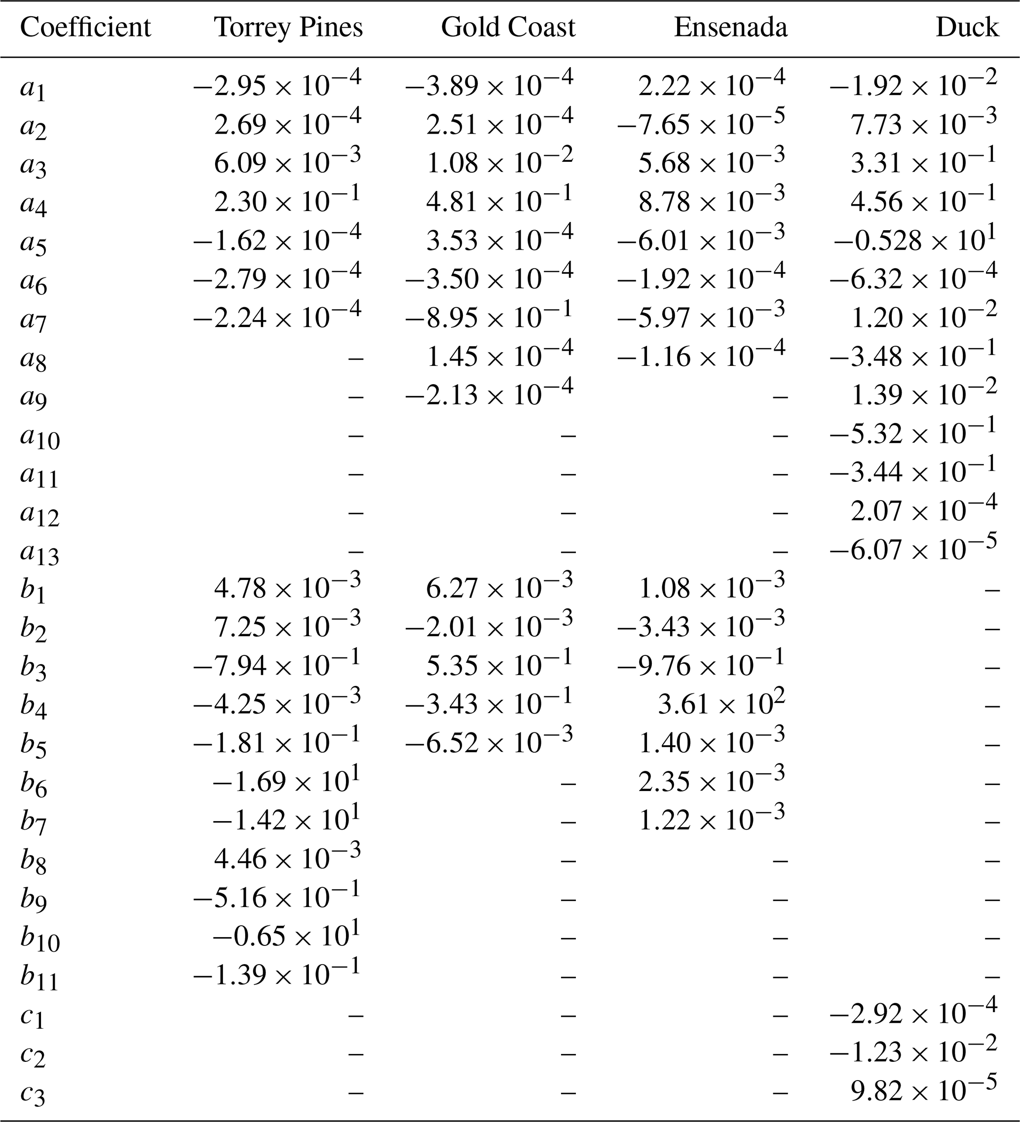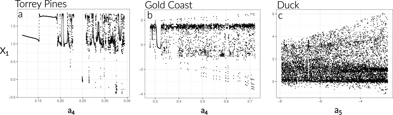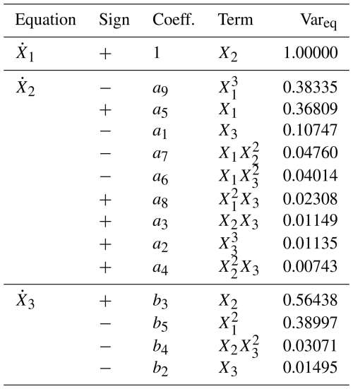The autonomous polynomial models reconstructed for each site are presented in Eqs. (6)–(8). All systems follow a canonical form in which the first equation expresses the temporal derivative of the shoreline position (), while the subsequent equations describe the nonlinear coupling between shoreline acceleration () and sandbar dynamics (X3, and X4 for Duck).