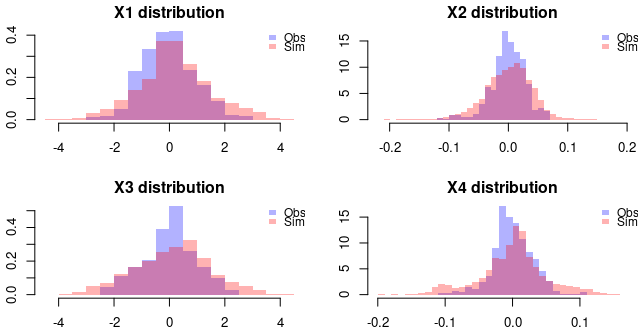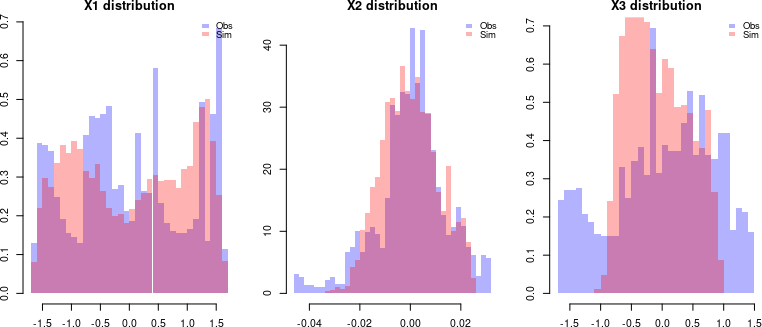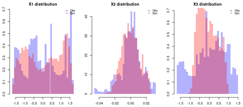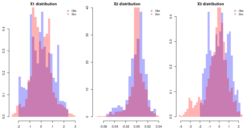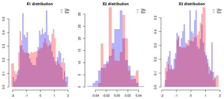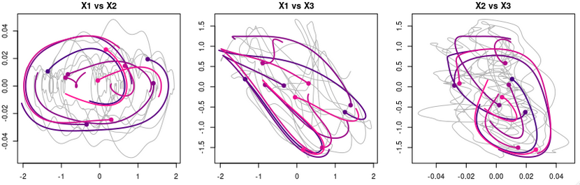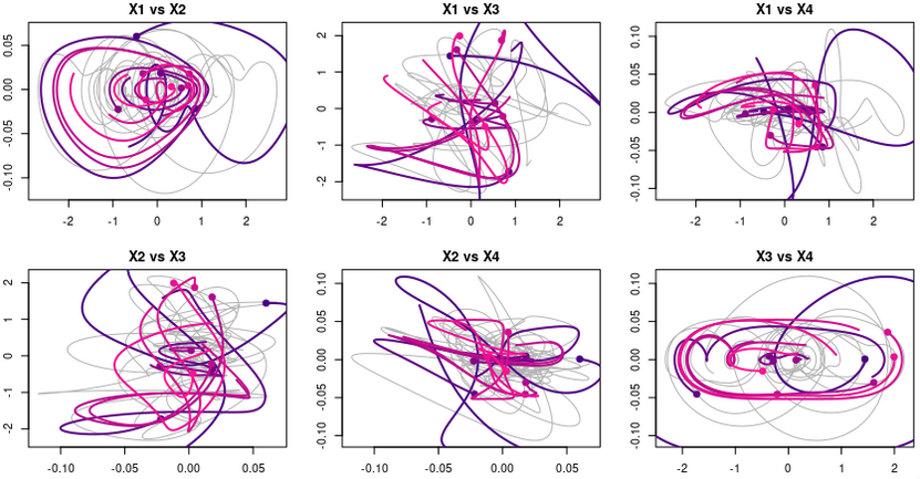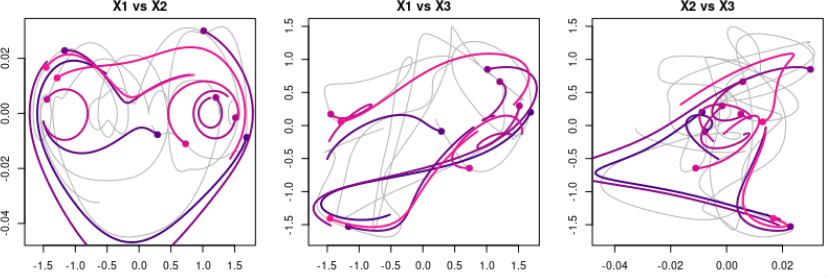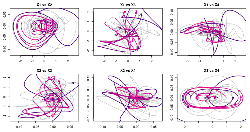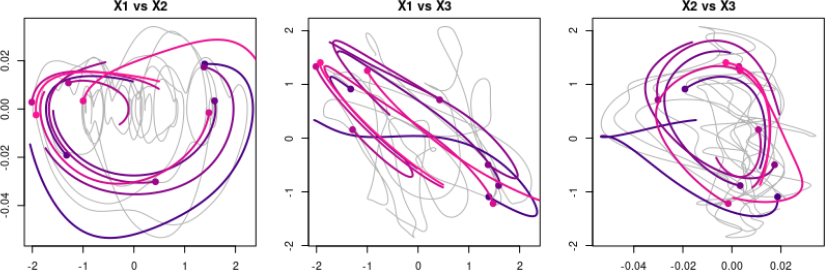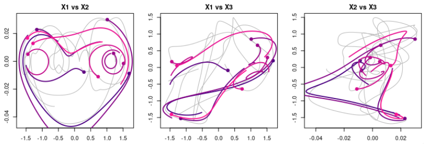 The GPoM package (Mangiarotti et al., 2012; Mangiarotti and Huc, 2019) implements this approach in R and provides a semi-automated framework for model discovery, selection, and validation. It systematically explores combinations of polynomial terms given the number of state variables m, the maximum polynomial degree dmax, and the maximum derivative order. Each candidate model is numerically integrated and compared with observations using statistical and geometric criteria such as variance preservation, correlation between observed and simulated variables, as well as structure reliability of the reconstructed attractor in the phase space.