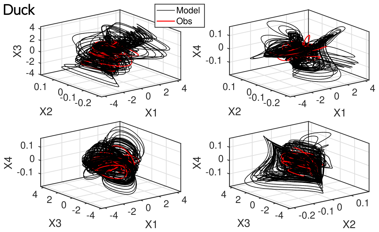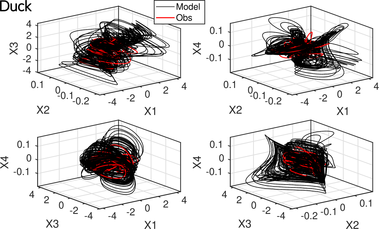 To further assess the quality of the phase-space reconstruction, additional phase-space projections are provided in Appendix B. These projections (Figs. B5 and B6) confirm the overall geometric consistency between modeled and observed trajectories beyond what is visible in two-dimensional projections. Because it is difficult to go further in the comparison between the original and modeled phase space from a deterministic point of view, alternative spectral and statistical validation approaches may instead be considered (see next Sect. 3.1.2).
