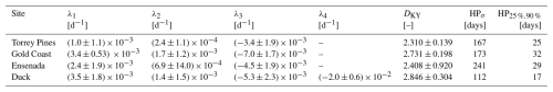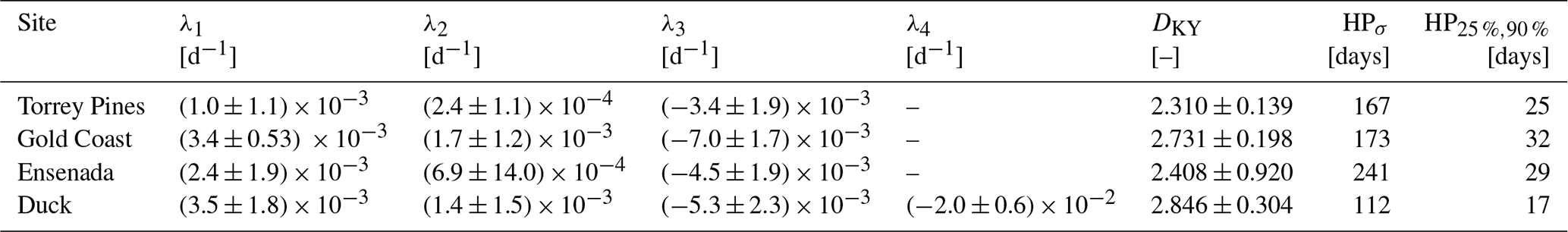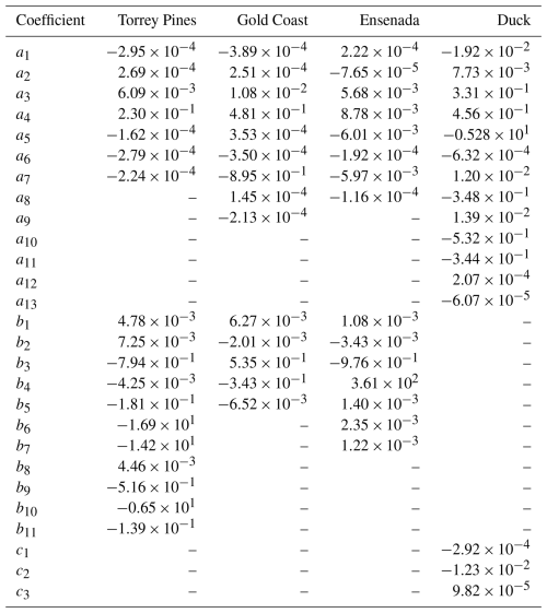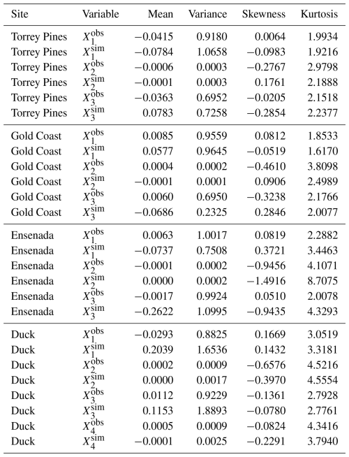 These results show that the GPoM models satisfactorily reconstruct the essential physics of the sites observables directly from observational data. They capture the nonlinear coupling between shoreline and sandbar, the characteristic oscillatory attractors, and the broadband red spectral behavior; typical from natural coastal systems (Ruessink et al., 2007; Pianca et al., 2015). As such, the models can be viewed as compact, deterministic reduced-order representations of the observed dynamics, capable of reproducing their key statistical and structural properties, and suitable for further investigation of the system's intrinsic dynamics and shoreline–sandbar coupling. Of course, spectral consistency alone does not uniquely constrain the underlying dynamical structure as distinct dynamical systems can share similar power-law spectra while differing fundamentally in their phase-space geometry. The spectral validation presented here is therefore a necessary but not sufficient condition for the validity assessment of the reconstructed dynamics. To complement this, the forecasting error growth was also estimated for each model, providing a statistical view of model performance. The horizon of predictability HP25 %,90 % varies from 0.5 to 1 month, depending both on the model and on the instability of the dynamics (see Sect. 3.3). Unfortunately, there are no equivalent autonomous models against which these performances can be easily compared. Nevertheless, one can refer to analyses based on neural networks, which clearly show that error growth sharply increases during the first 50 to 100 d (Pape et al., 2007). It can also be noted that characteristic times ranging from 15 to 30 d are commonly used to simulate cross-shore evolution, and much shorter timescales of 0.5 to 6 d during very rapid events (Hewageegana and Canestrelli, 2021); these characteristic prediction times, over which satisfactory predictions are obtained, are consistent with the predictability of the GPoM models. Finally, a histogram of the distributions of the variables (Figs. B1–B4) and the associated statistical moments from first to fourth order (Table B1) show that the models consistently reproduce the statistical properties of most state variables, including the shape, spread, and asymmetry of their distributions across all sites. As with spectral properties, the variable distributions do not uniquely characterize the underlying dynamical structure. Hence, the validation presented here is therefore a necessary, but not sufficient, condition for model assessment.