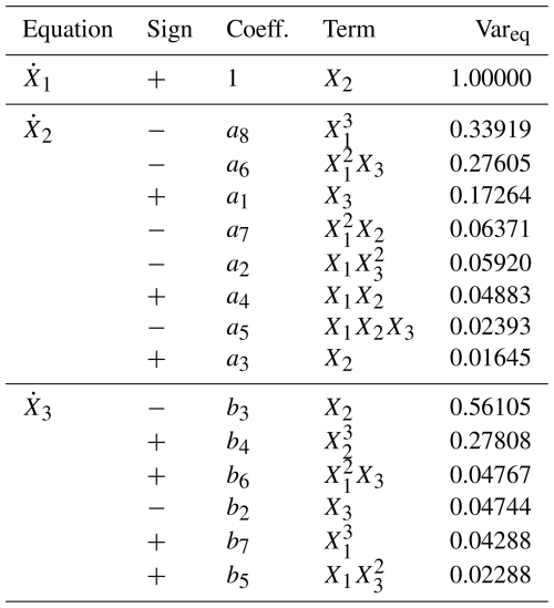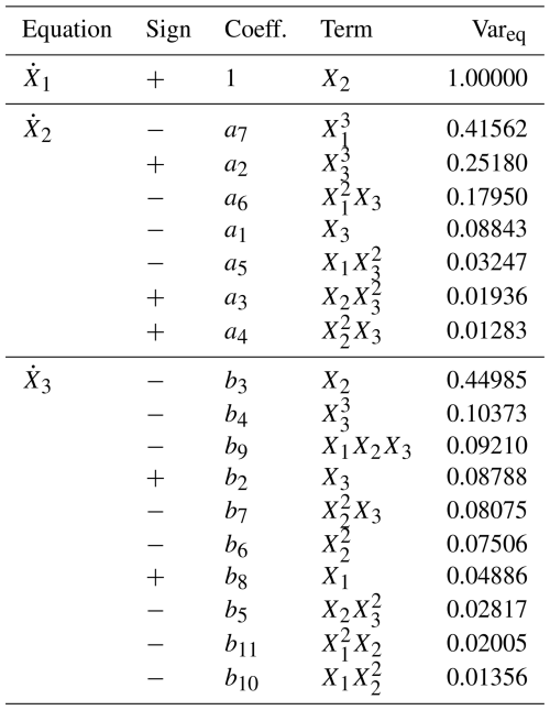 One of the few existing frameworks offering a semi-automated implementation of the global modeling approach is the Global Polynomial Modeling (GPoM) package (Mangiarotti et al., 2012). Developed in R, this package integrates a suite of algorithms designed to reconstruct low-dimensional deterministic systems directly from time series. GPoM identifies parsimonious polynomial equations capable of reproducing the observed phase-space geometry and attractor structure by iteratively selecting the minimal subset of nonlinear terms that preserves the variance and structural properties of the reconstructed trajectories. This procedure provides an interpretable representation of the underlying feedbacks and coupling mechanisms between variables involved, and enables testing for deterministic structure within empirical dynamical systems. Such an approach is particularly relevant given that inferring the underlying dynamics of chaotic geophysical systems from noisy and incomplete observations remains a fundamental challenge in the environmental context characterized by low predictability (Jardak and Talagrand, 2018; Ruiz et al., 2022).